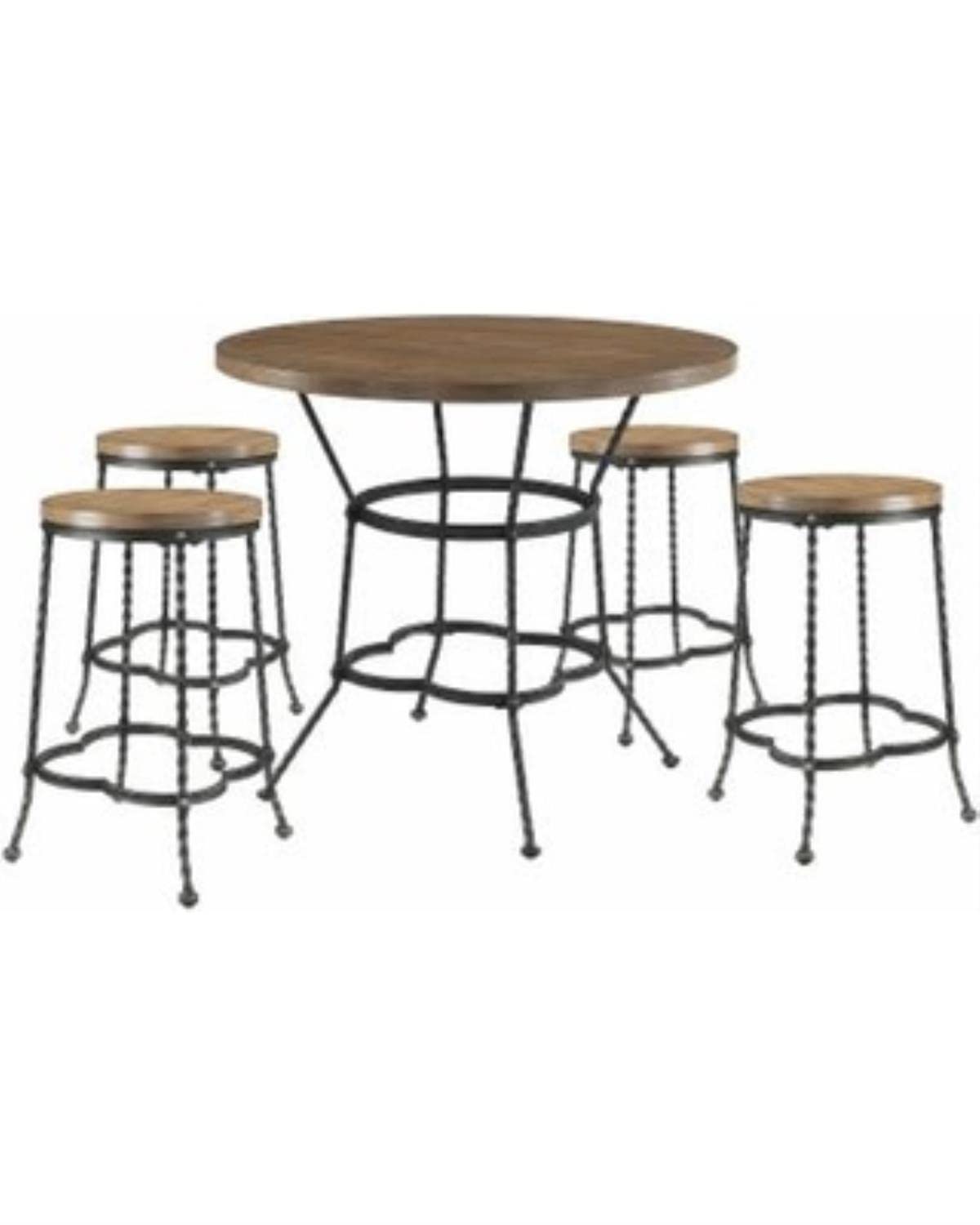 Includes one table and four chair. Industrial style. Round leg table. Wooden top table. Backless armless stools. Round shape wooden seat. Metal frame. Made from veneer and composite wood. Assembly required. Seat: 24 in. H. Table: 42 in. Dia. x 36 in. H (118 lbs. ). Modern and versatile the Qamar dining set is perfect for both morning coffee and a chic dinner party. The round table features a unique oak finish table top and an antique black metal base. This classic industrial styled table and chairs have crossbar support and its durable construction, the top is sure to catch the eye of anyone who walks in the room. This dining set will be an ideal piece to complete your loft-inspired space.