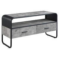 Bring a little Industrial style to the living room with this TV stand. This stand features a grey concrete finish, black metal frame, and a streamlined silhouette for the look of a modern Industrial style. Open shelves give you spots to display DVD players and often-watched DVDs, while two drawers lend even more space to stash your collection of entertainment accessories. It is sure to bring a striking decorative effect to your living room.