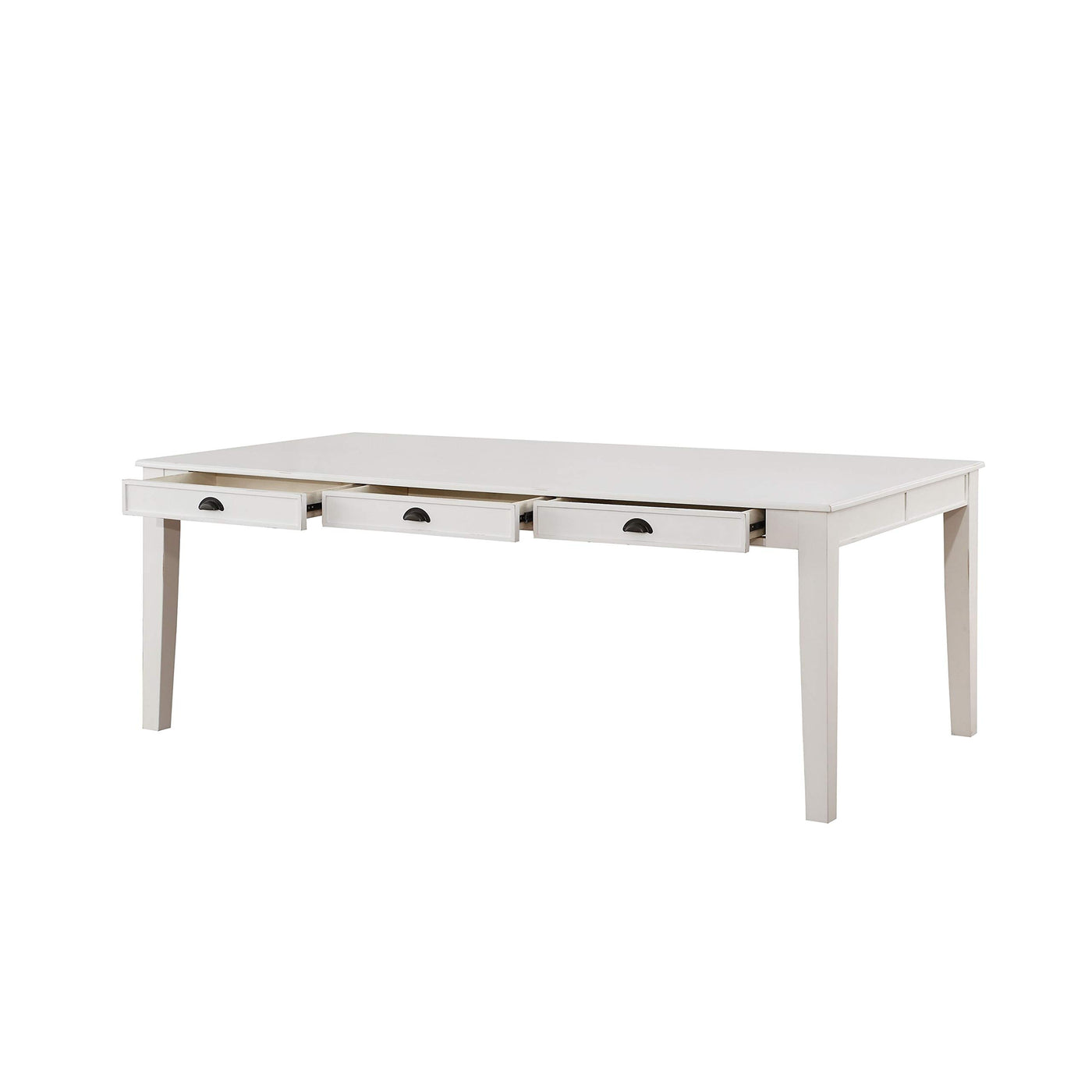 Friends and family will enjoy gathering around the charming farmhouse-style dining table. Finish in an antique white and black finish. The sturdy solid top, sleek tapered legs, and six storage drawers with cup pull, on both sides of the table, are perfect for storing napkins, extra placement, or other dining essentials. Its sturdy wooden construction will remain in the same pristine condition and serve for a long time.