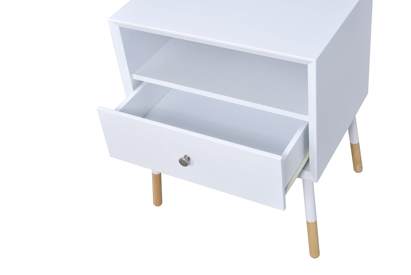 ACME Furniture 84453 Sonria II end table, Black & Natural. Round occasional Leg table. 1 drawer and 1 open storage compartment. End and side or Nightstand table. The country of Origin of the product is Taiwan.