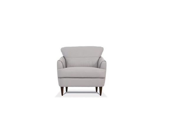 Designed with contemporary fashion, this beautiful pearl gray leather chair features a T-shape cushion with contrast tone stitching and unique tapered wood legs. Its deep, comfy seat and slope-style padded arms give it an incredible sink-right-in quality that's perfect for the whole family.