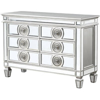 Show your confidence with some bold, shinning and hollywood glamour decorating ideas. The Varian Server will take your breath at first glance with so many amazing features like mirror inlay, tempting textures and geometric elements. A antique platinum finish gives this server a luxe appeal while beveled mirror inlay adds depth and luster to the appearance. There are six drawers accented with crystal-like pull-knobs and sunburst design fronts. Organize and style your dinign room with the Varian Server.