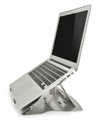 Compact, portable, and fold-out design allows for on-the-fly mobile computer station. Stand allows for several viewing angle adjustments providing the most comfortable and ergonomic viewing and typing positions. Most suitable for laptop use. Made of aluminum to assist with portability and heat dissipation.