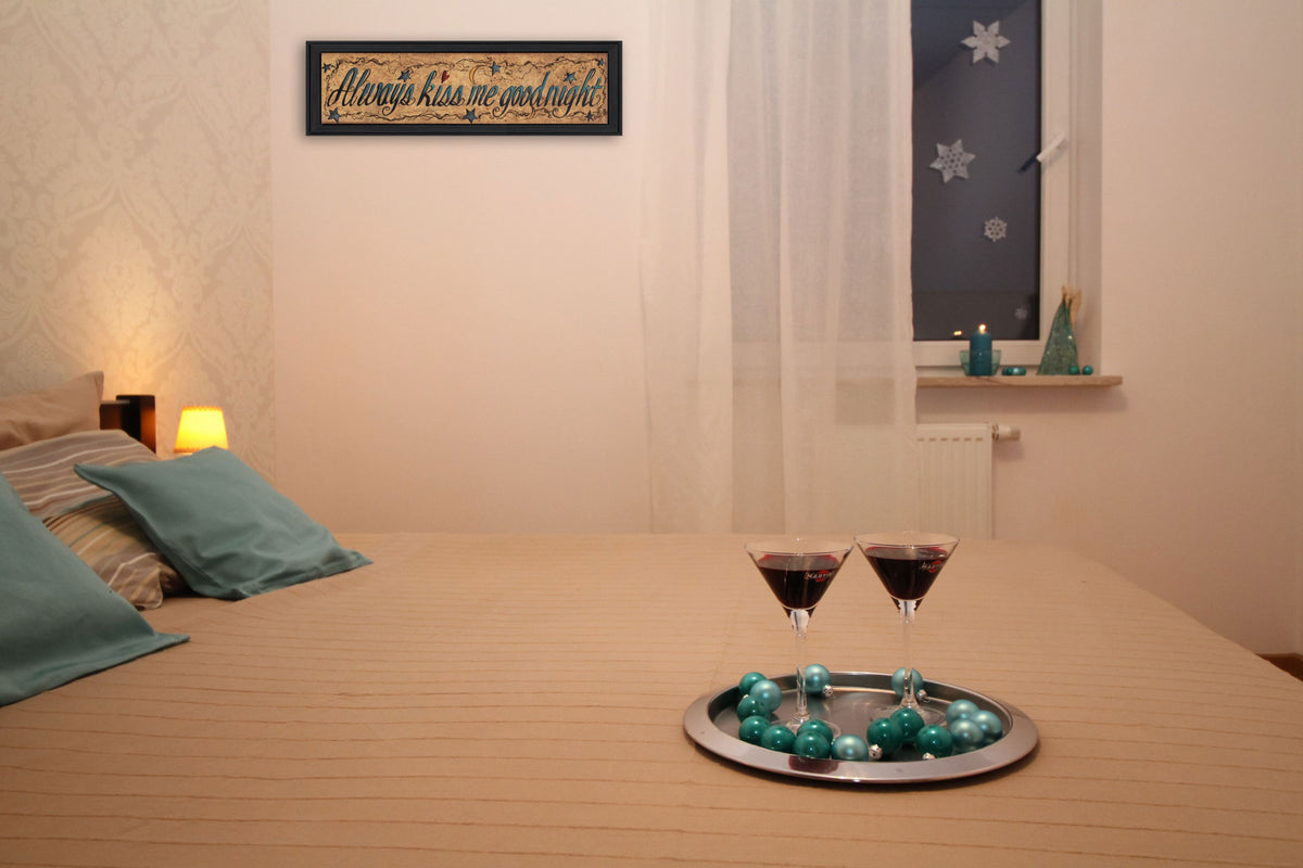 This always kiss me goodnight 1 black framed print wall art will add a beautiful decorative accent to your decor. This print is a visual artistic expression that allows you to decorate your space in style. Reproduced for you on paper, this hanging accent will be a trendy and fashionable way to dress your Adding this hanging wall art to make your room feel more finished and attractive. Instantly liven up your space with this art that brings color and feel. Your walls. 8' H x 23' W x 1' D