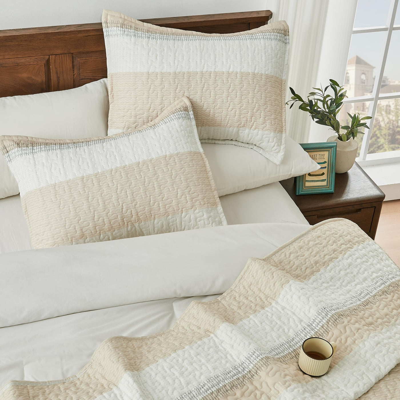 Andency King Size Quilt Set Beige, 3 Pieces Beige Ultra Soft Lightweight Bedspreads & Coverlets Set, Patchwork Striped Quilted Bedding Sets For All Seasons (1 Quilt, 2 Pillow Shams)
