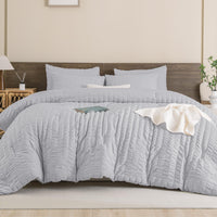 Q: What materials are used in the Andency Light Grey Comforter Set?A: The Andency Light Grey Comforter Set is made from premium soft microfiber, featuring a 100% cationic dyeing seersucker fabric on the front side for a unique design and a brushed microfiber material on the backside for ultimate softness and coziness.