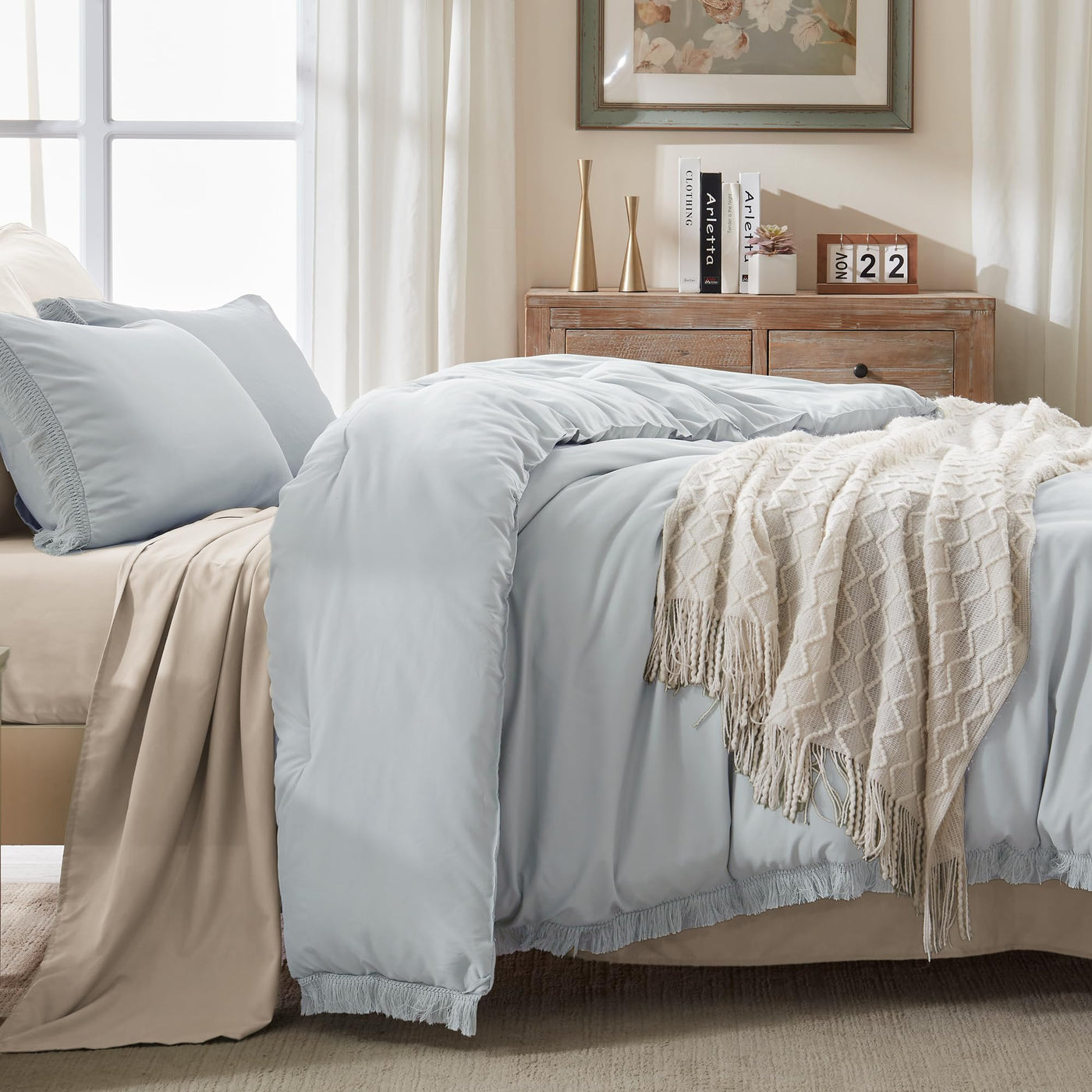 Andency Light Grey Comforter Set Queen, 3 Pieces Boho Tassel Lightweight Bedding Comforter Sets, All Season Soft Fluffy Fringe Bed Set (90X90In Comforter & 2 Pillowcases)