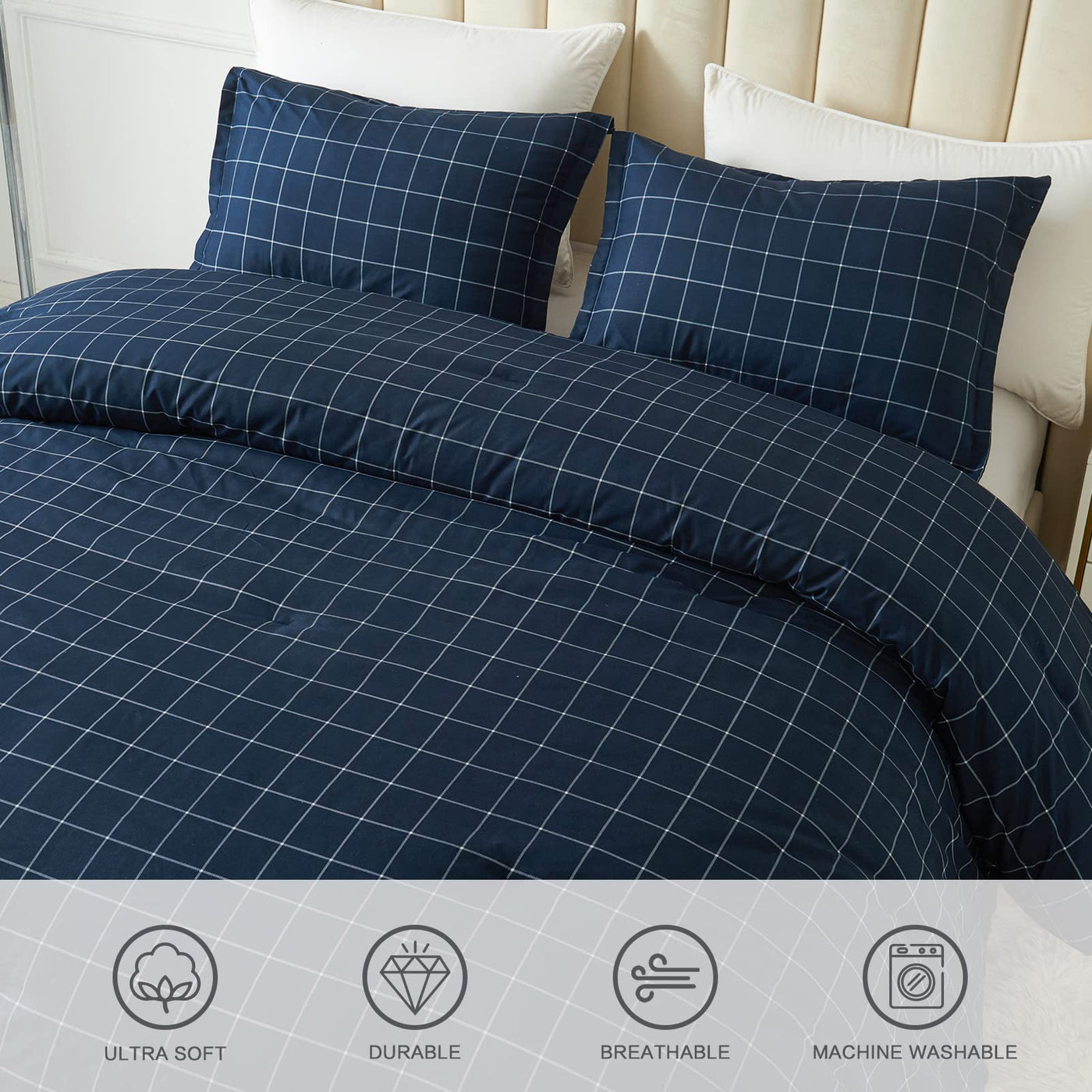 Andency Navy Grid Comforter Set Queen Size (90X90 Inch), 3 Pieces(1 Grid Comforter And 2 Pillowcases), Summer Lightweight Microf