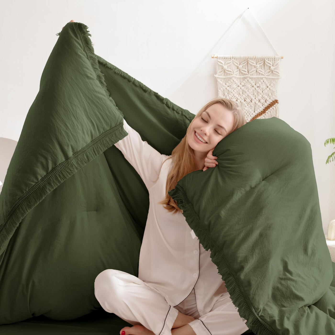 Andency Olive Green Comforter Set Full Size, 3 Pieces Boho Tassel Lightweight Bedding Comforter Sets, All Season Soft Fluffy Fringe Bed Set (79X90In Comforter & 2 Pillowcases)