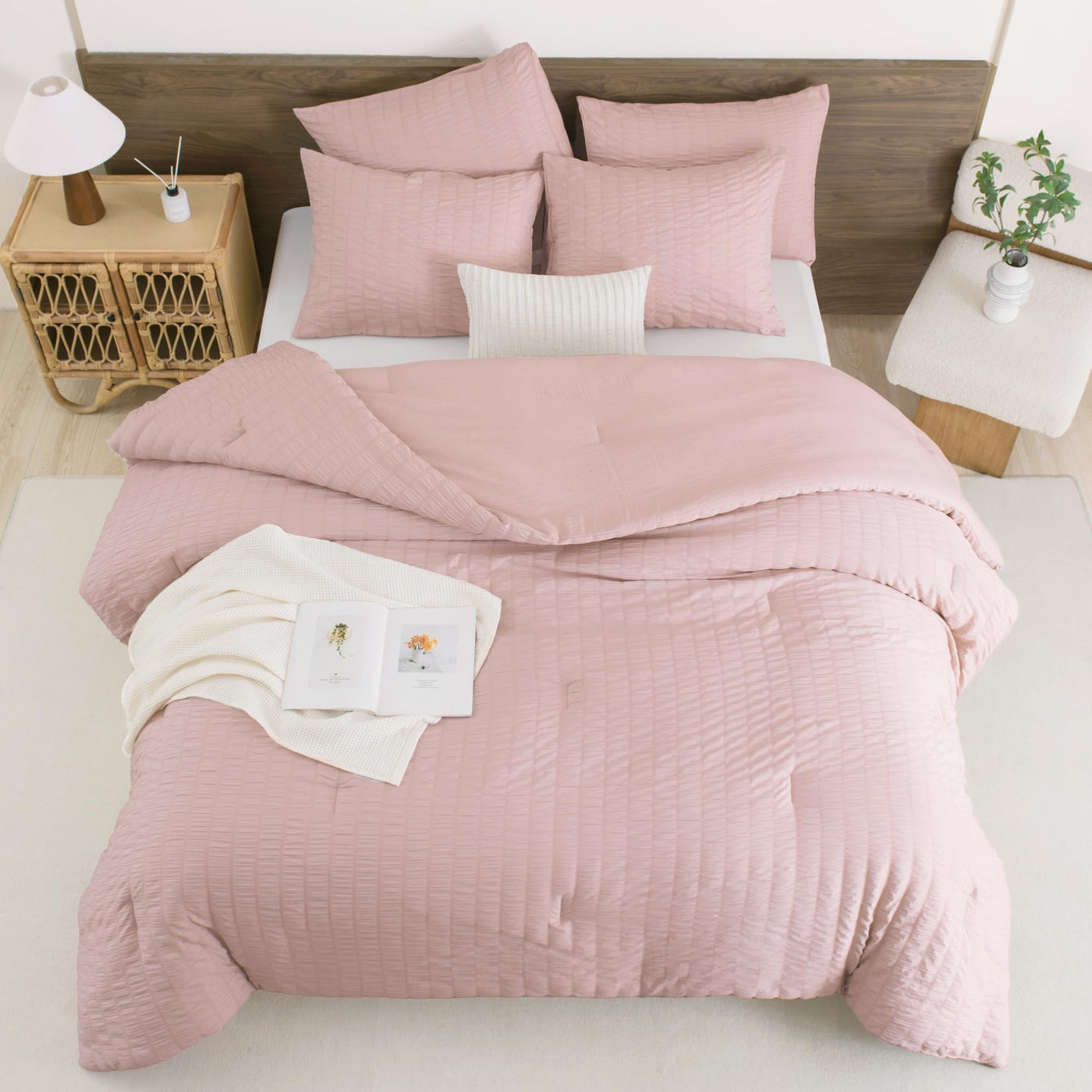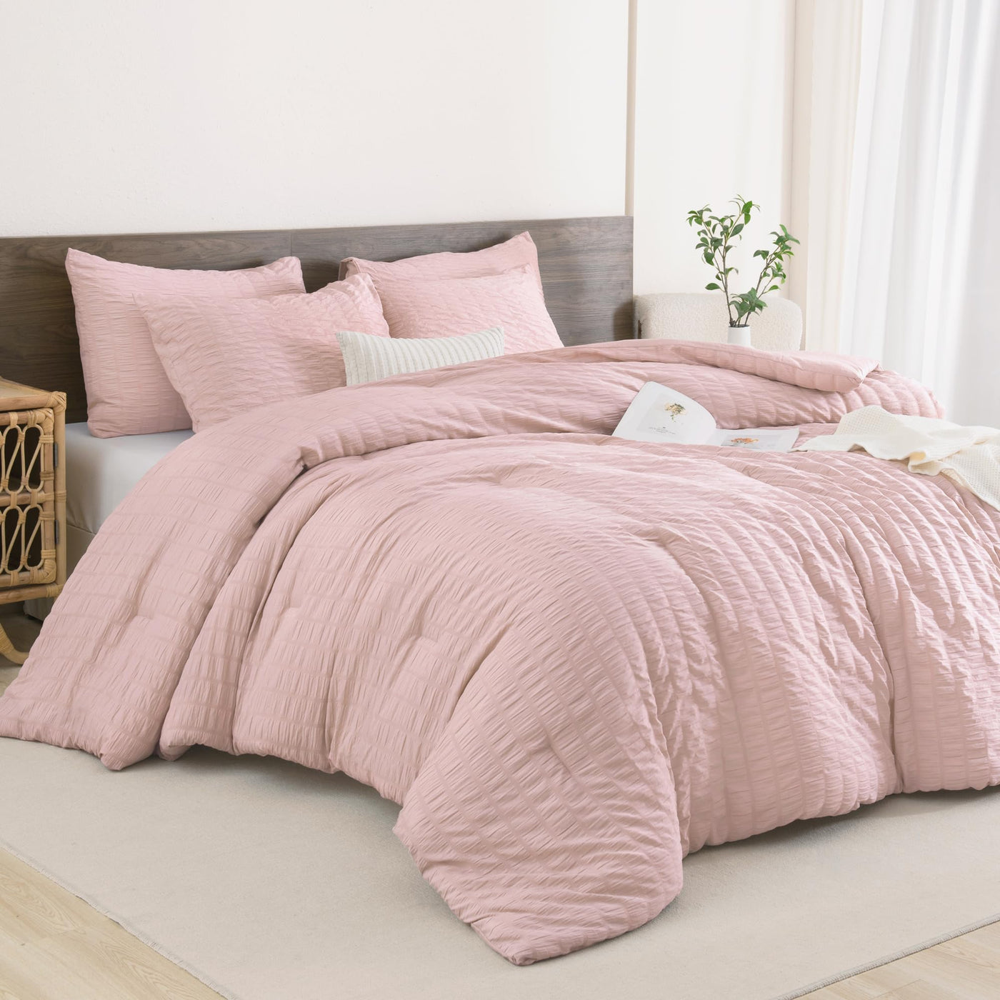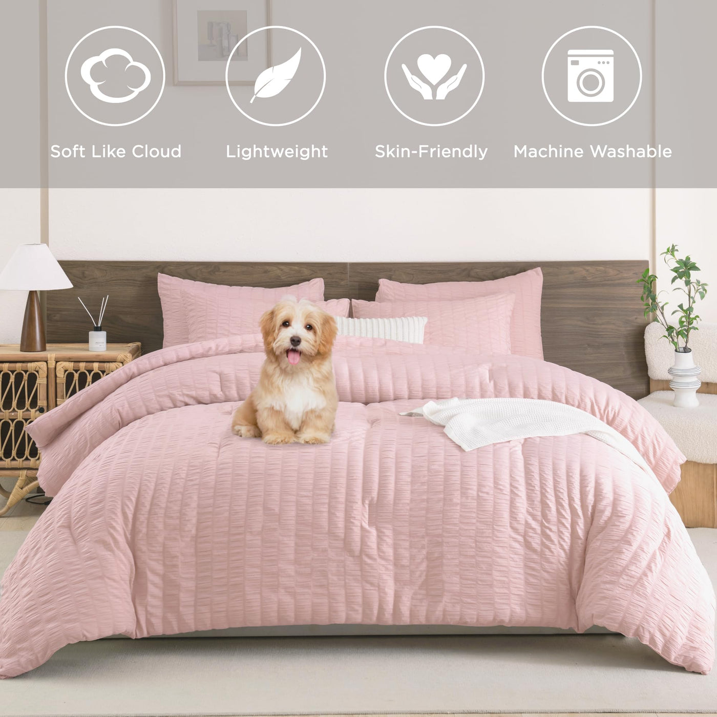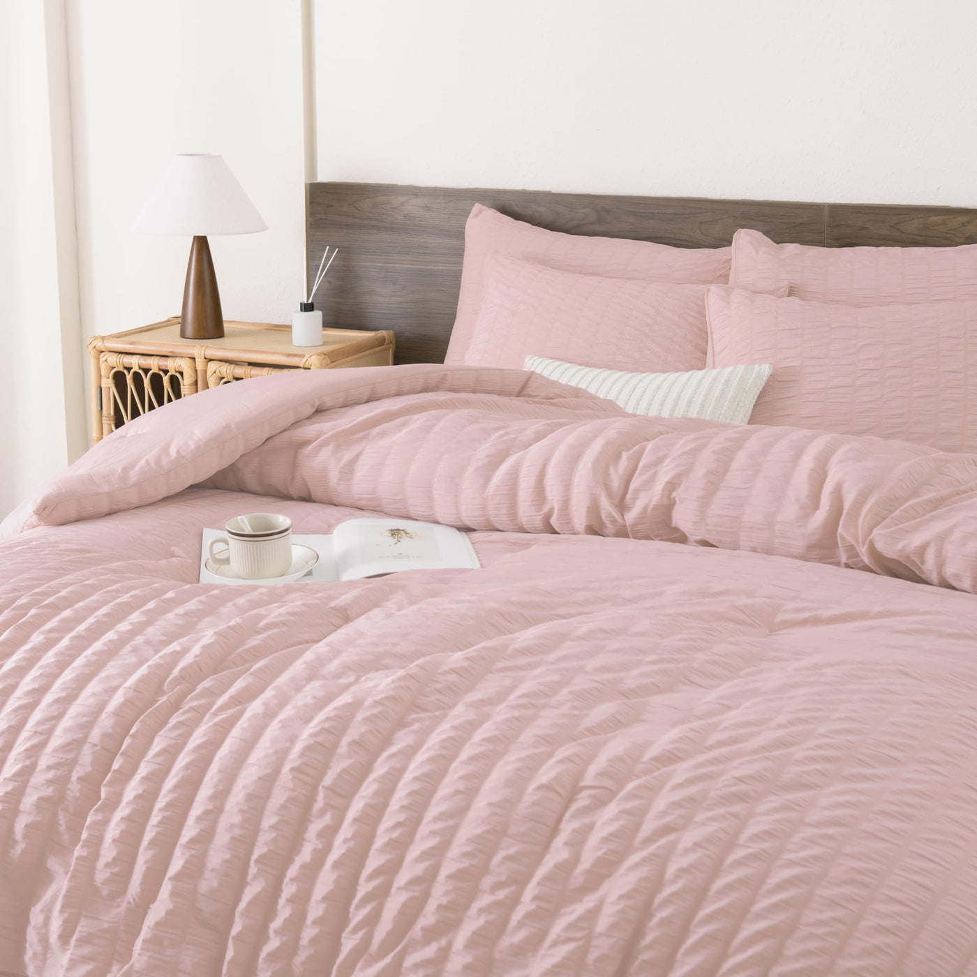 Q: What makes the seersucker design unique in this comforter set?A: The seersucker design features a slight pleat that creates a three-dimensional wavy visual effect, adding a stylish and elegant touch to your bedroom decor.