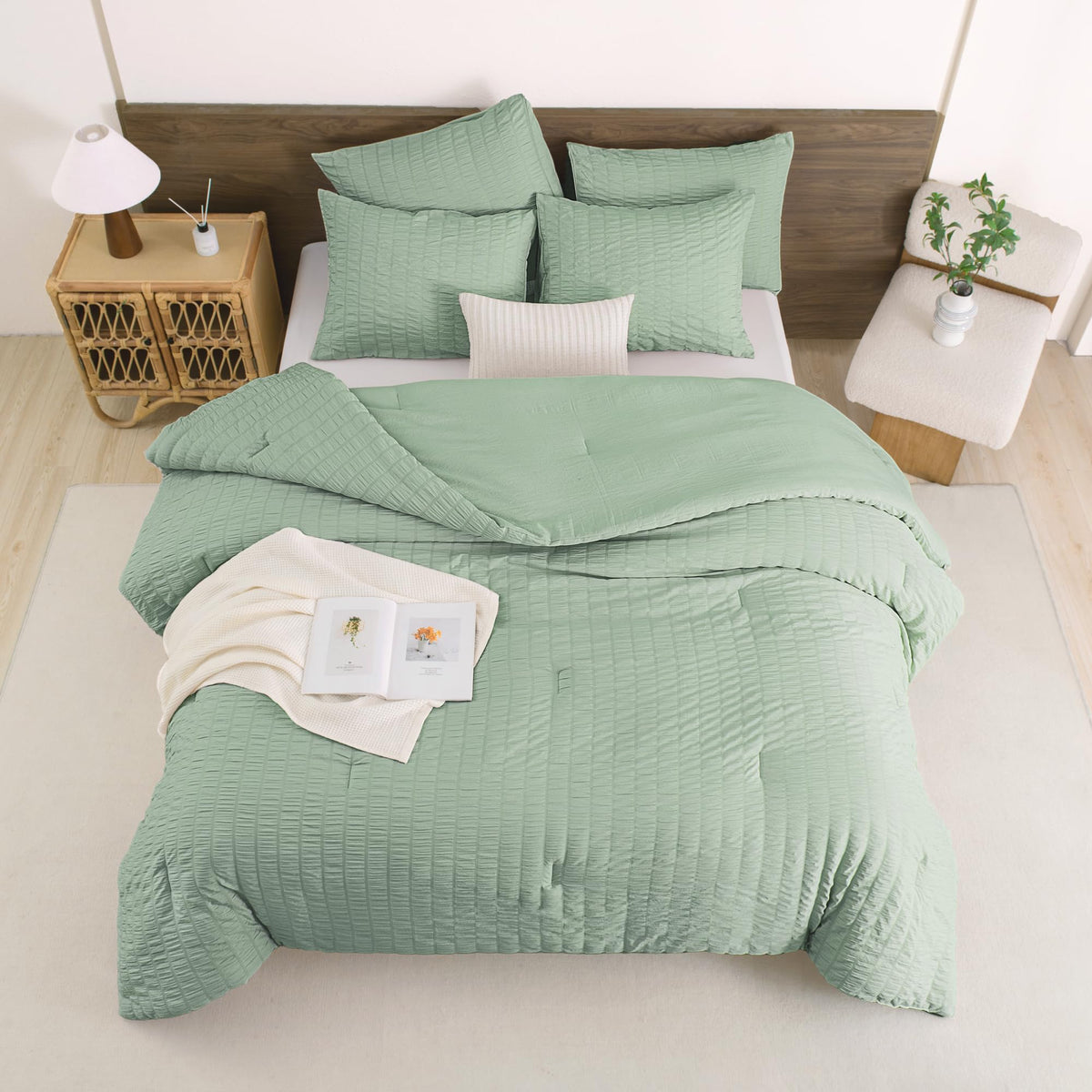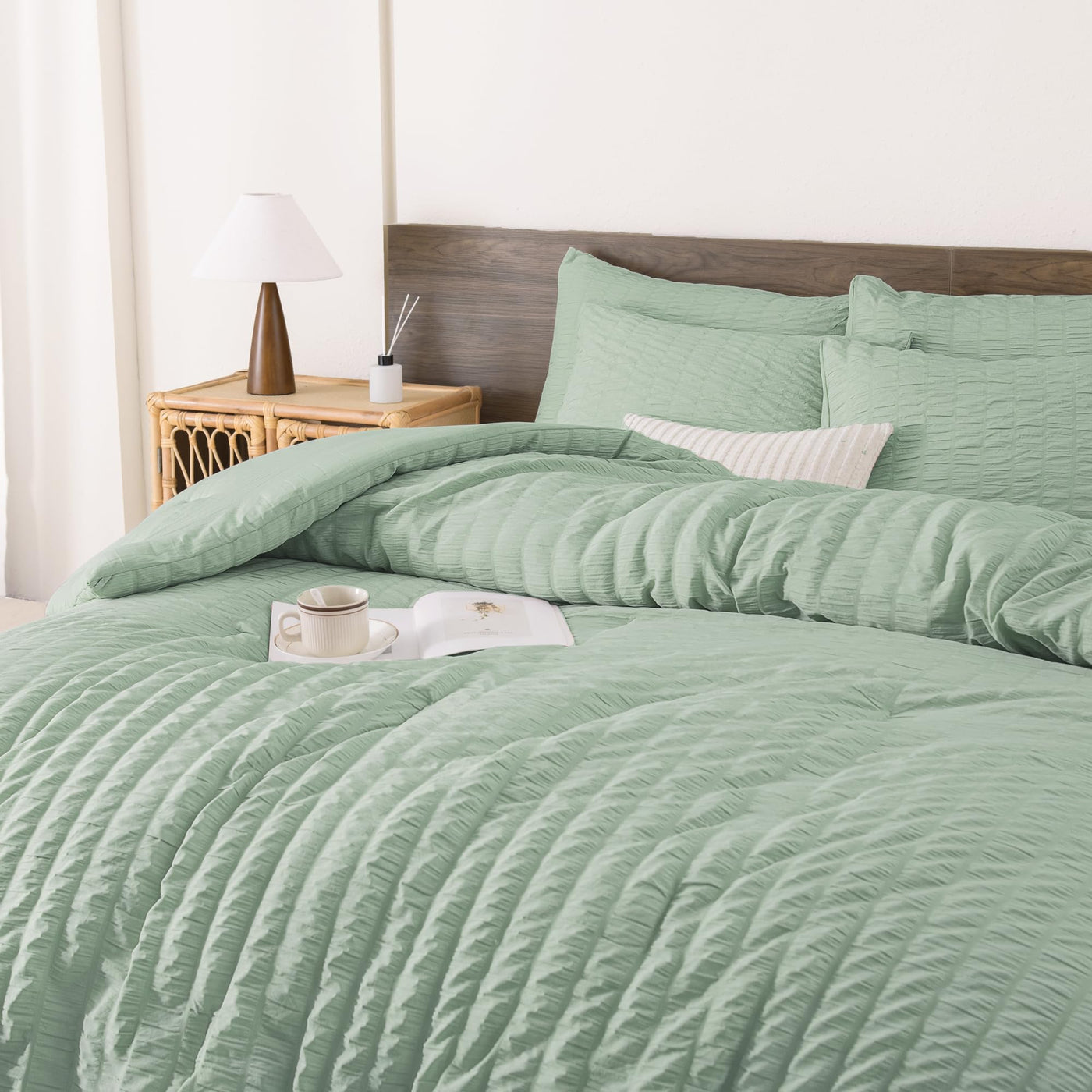 Q: How does the seersucker design benefit the comforter set?A: The seersucker design offers a chic and stylish look with a three-dimensional wavy effect, enhancing the aesthetic appeal of your bedroom while fitting various decoration styles.