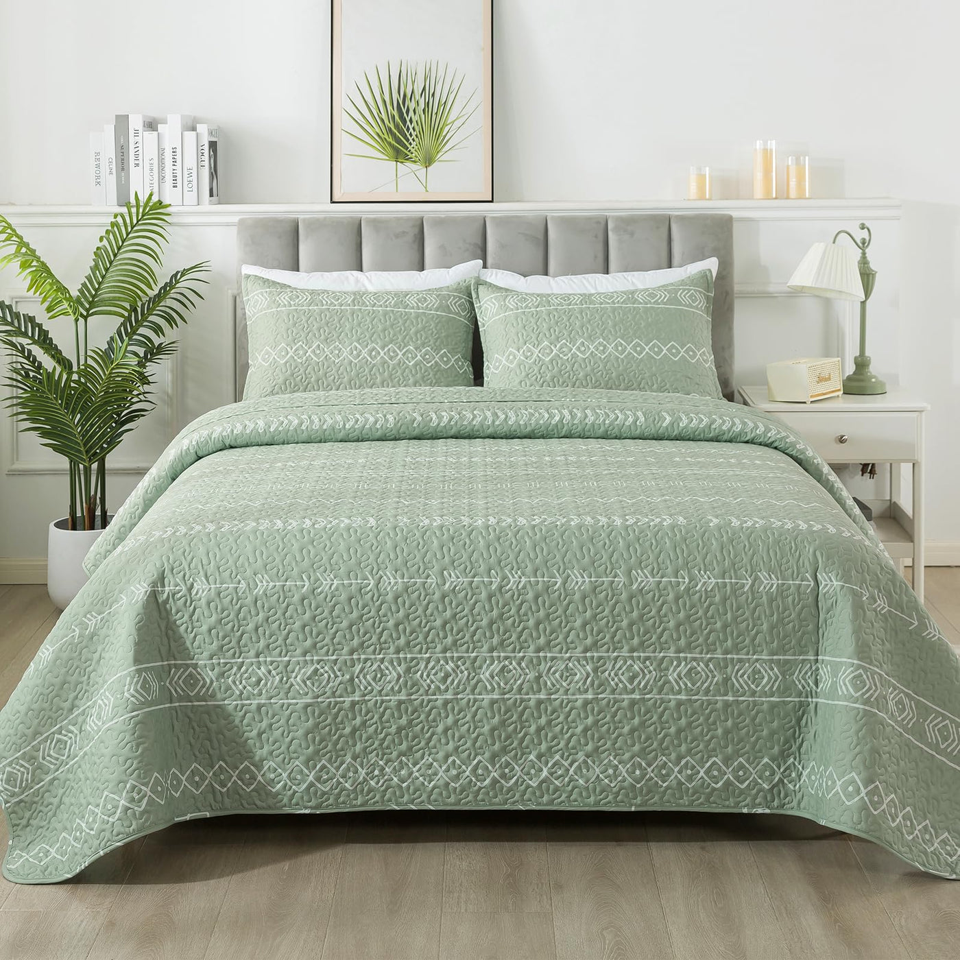 Andency Sage Green Quilt Set Queen (90X96 Inch), 3 Pieces(1 Striped Triangle Printed Quilt And 2 Pillowcases), Bohemian Summer L