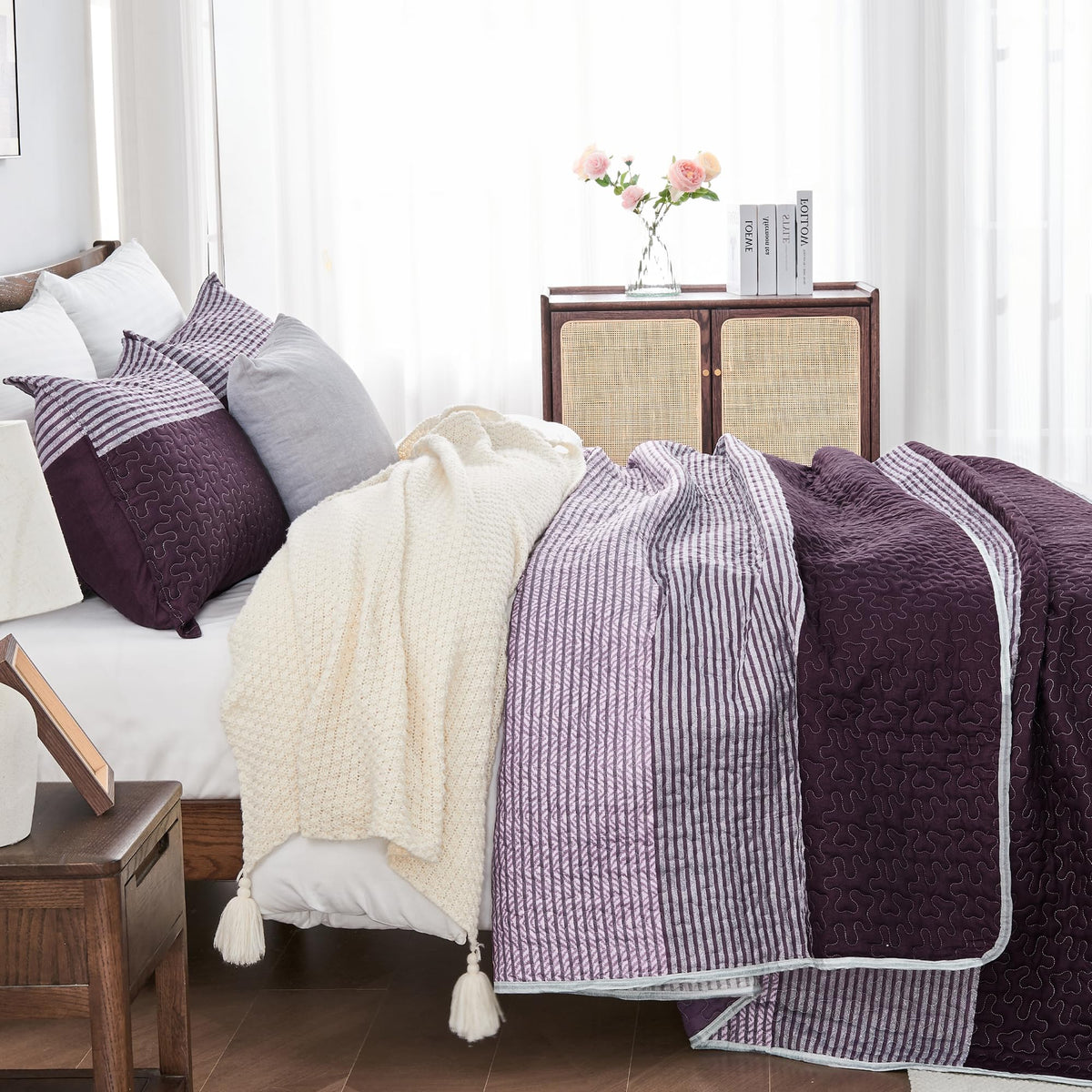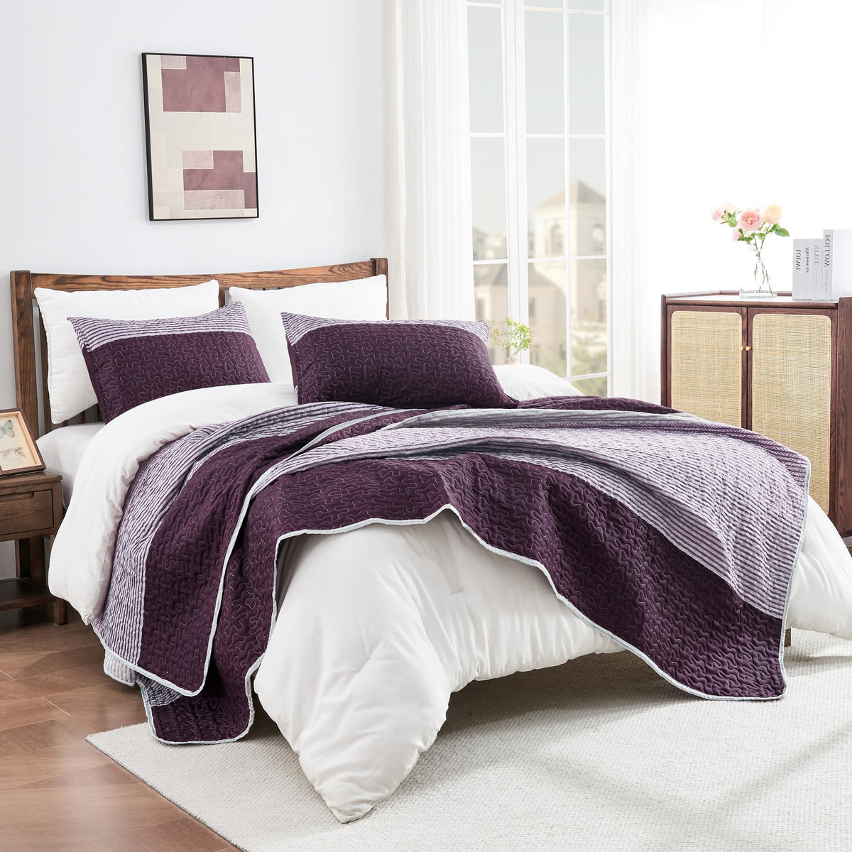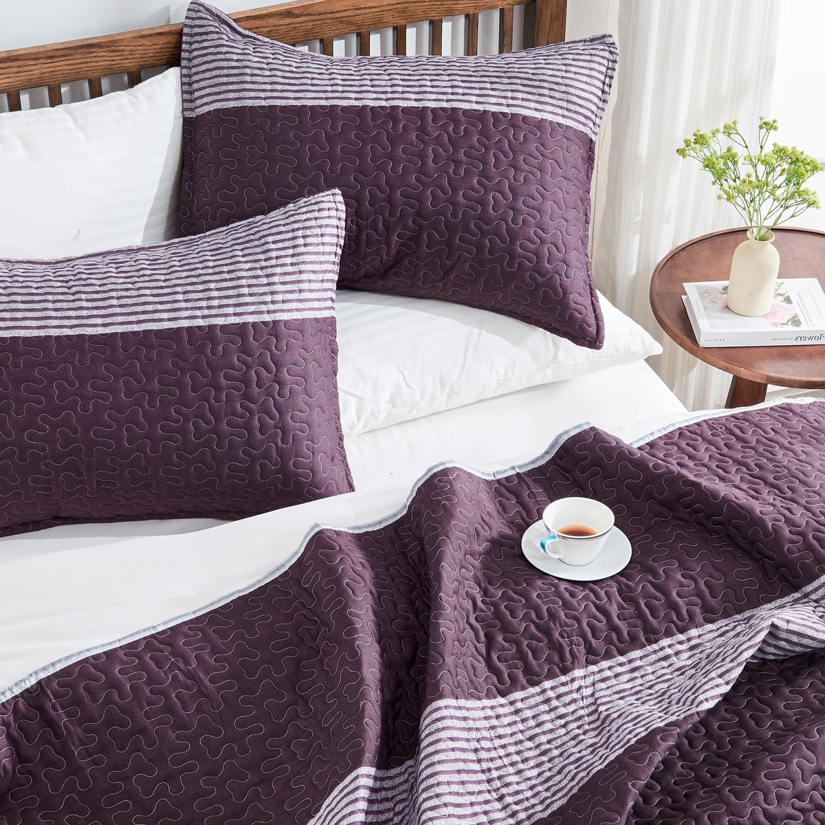Andency Stripe Quilt Set Twin(68X86Inch), 2 Pieces (1 Striped Quilt And 1 Pillowcase) Purple And Grey Patchwork Bedspread Coverlet Set, Soft Microfiber Quilted Bedding Set