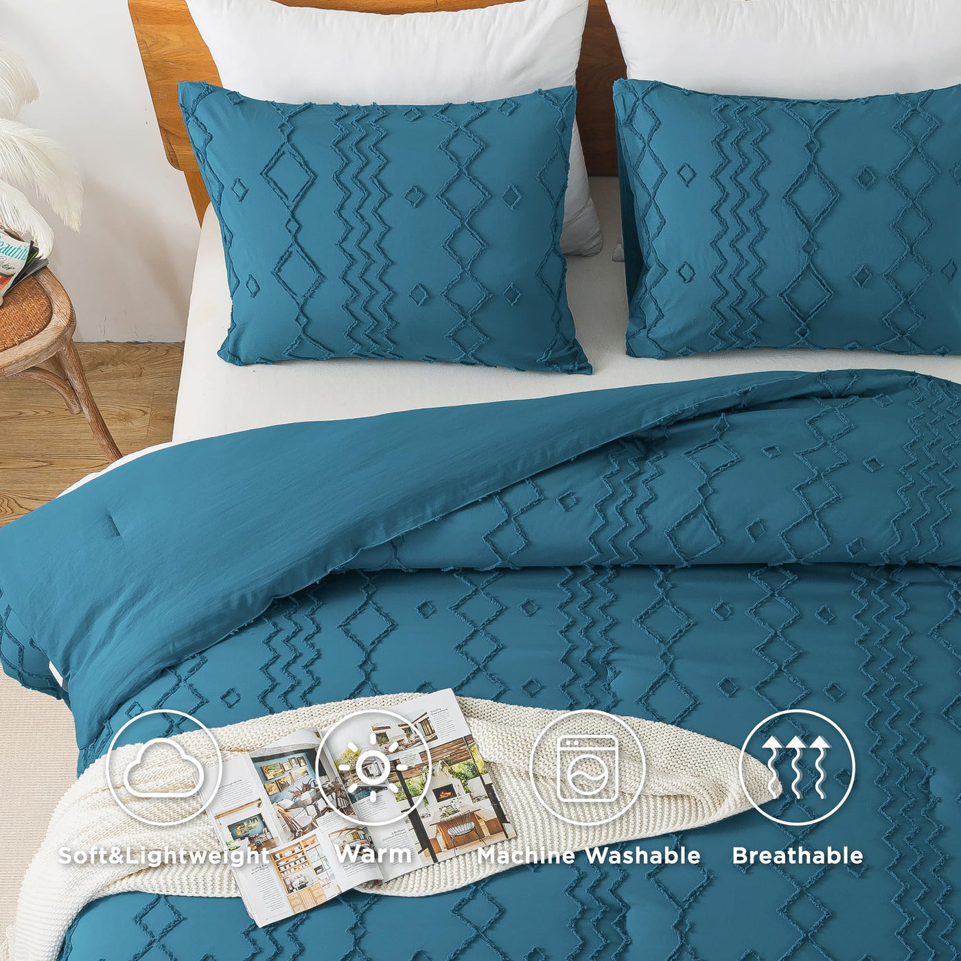 Andency Teal Tufted Comforter Set King(104X90Inch), 3 Pieces(1 Boho Comforter, 2 Pillowcases) Textured Farmhouse Comforter, Soft Microfiber Down Alternative Geometric Comforter Bedding Set