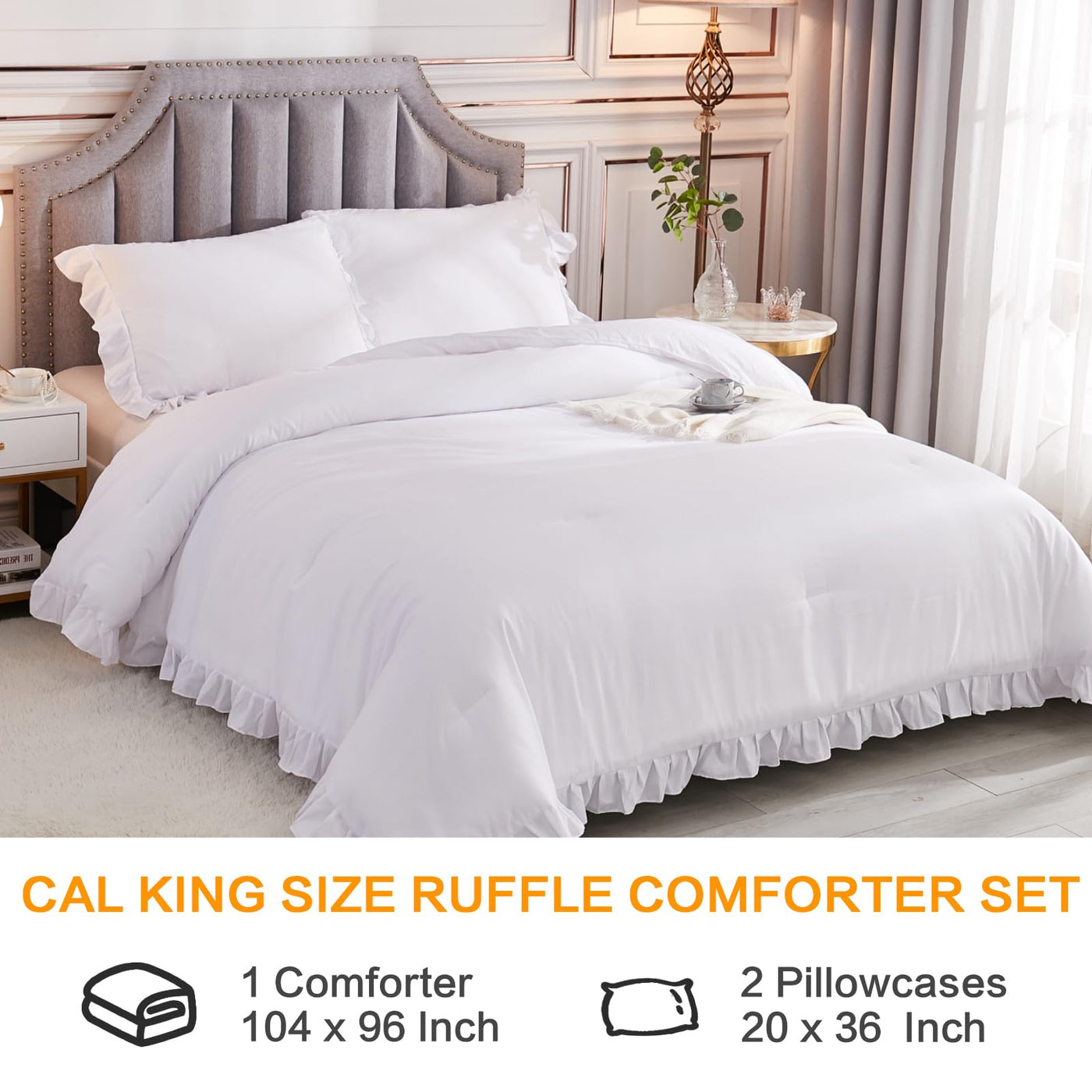 Andency White California King Comforter Set, 3 Pieces Shabby Chic Ruffle Solid Cal King Bedding Sets, Oversized All Season Soft Lightweight Down Alternative Bed Set For Adults Men Women