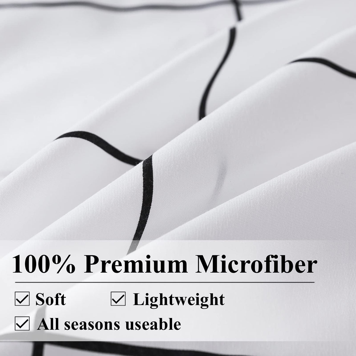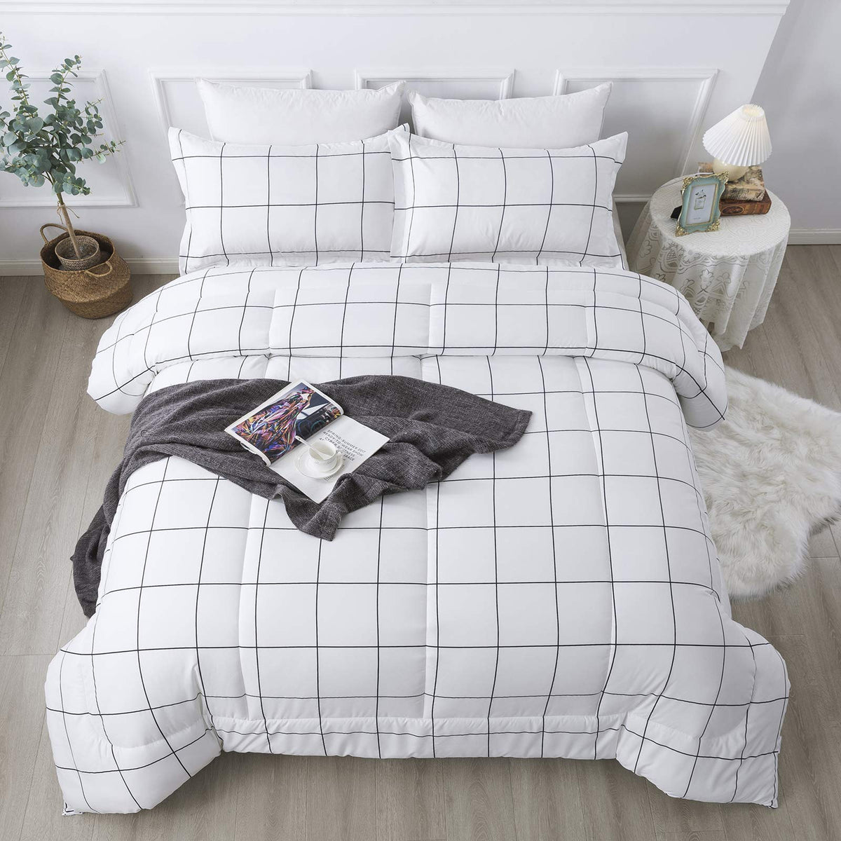 Q: What materials are used in the Andency White Grid Comforter Set?A: The Andency comforter set is made from high-quality microfiber, which is lightweight, soft, and comfortable, featuring down alternative filling for added warmth.