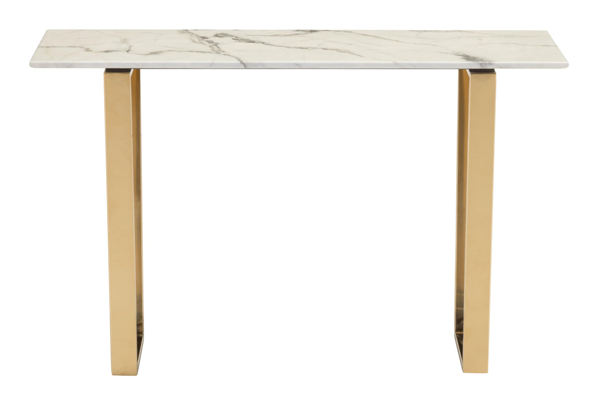 On-trend and decidedly modern, this beautiful console table will be on every designers list. Gorgeous from every angle, the rectangular faux marble top seems to float atop its simple gold geometric base. Long and narrow to fit in most spaces and is perfect for your entry, dining or living space. Pair with the Atlas coffee and end table.