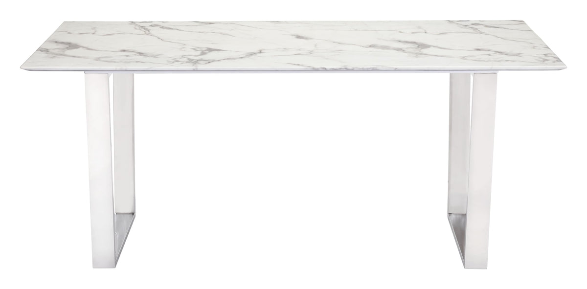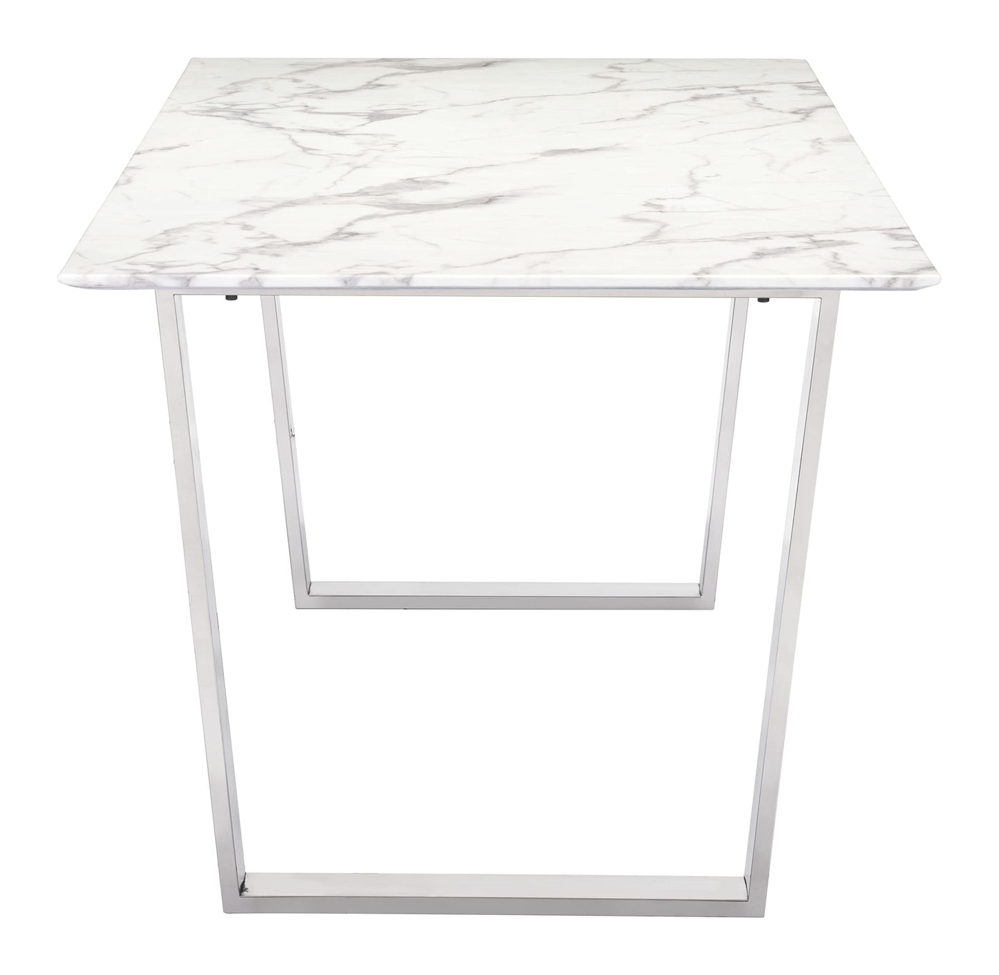 On-trend and decidedly modern, this sophisticated dining table will be on every designers list. Gorgeous from every angle, the rectangular faux marble top seems to float atop its simple brushed silver base. Long and narrow to fit in most spaces, it’s a perfect piece for your dining room or kitchen. Pair with the Atlas console for use as a sideboard or extra serving surface.