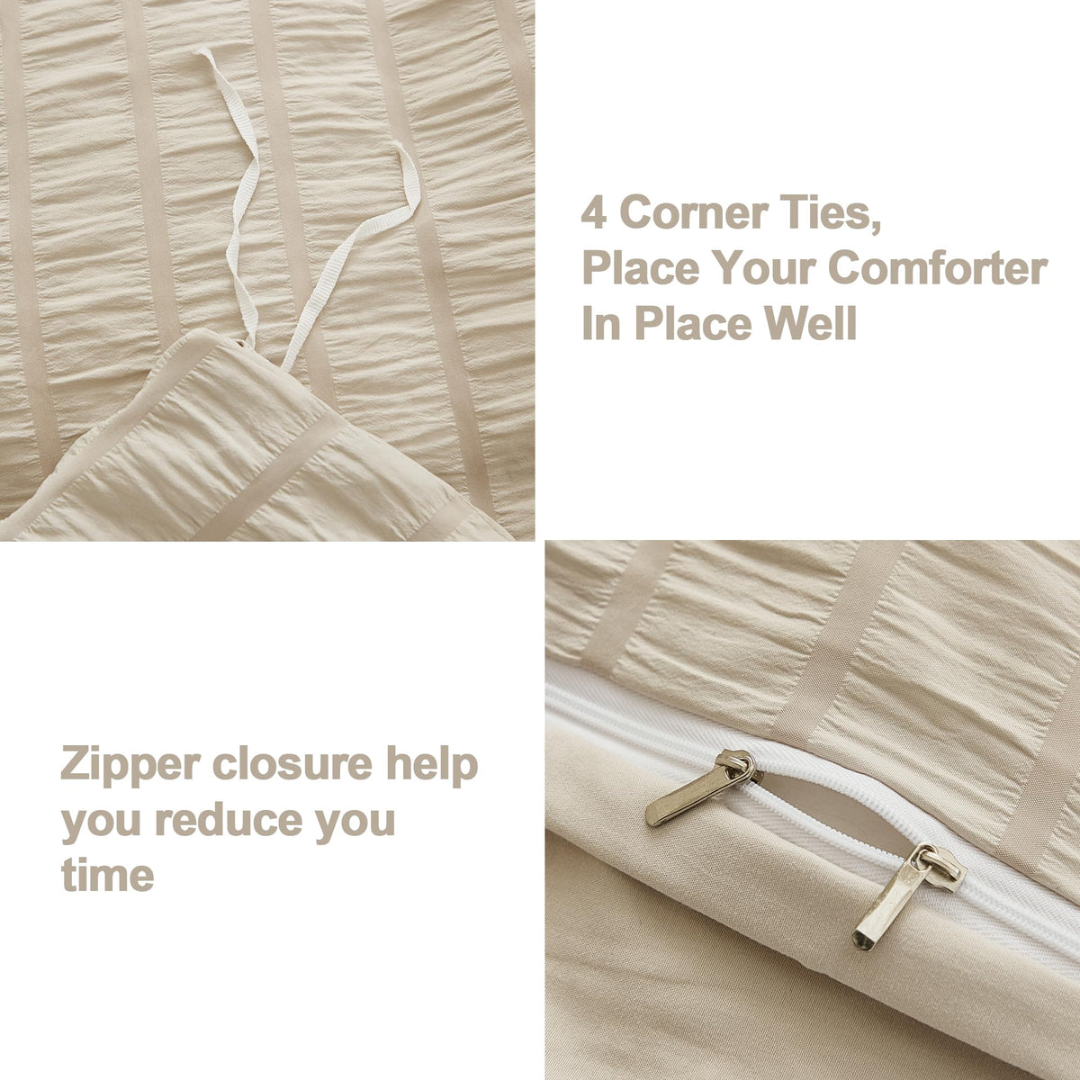 KEY FEATURES 100% washed microfiber Our duvet cover sets appear the texture of lightweight seersucker, it could help you a good sleep all night corner ties 4 corner ties are designed to fix your comforter very well , don't worry about the comforter shrinking into a ball. metal zipper It could save your time and make it easier for you to take out your comforter and better place it, and metal zipper is stronger and not easily damaged