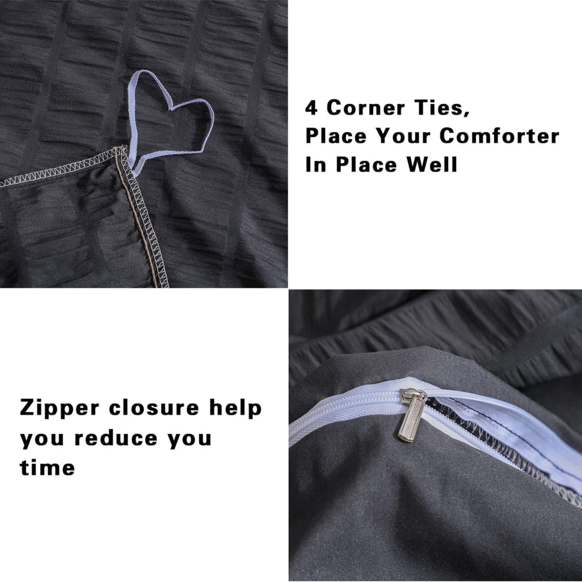 KEY FEATURES 100% washed microfiber Our duvet cover sets appear the texture of lightweight seersucker, it could help you a good sleep all night corner ties 4 corner ties are designed to fix your comforter very well , don't worry about the comforter shrinking into a ball. metal zipper It could save your time and make it easier for you to take out your comforter and better place it, and metal zipper is stronger and not easily damaged