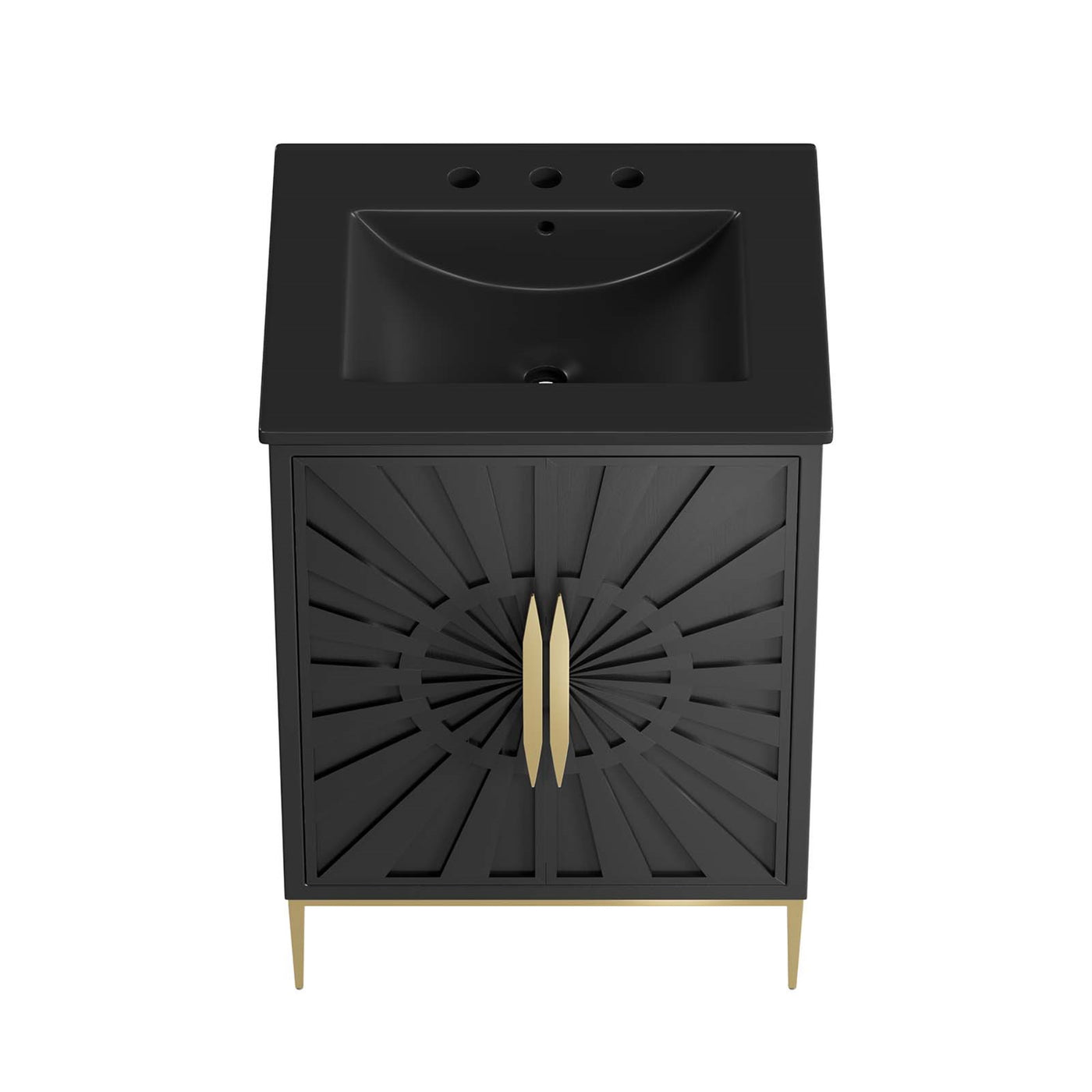 Intricate modernity radiates into your bathroom space with the Awaken 24'' Bathroom Vanity. Showcasing clean lines arranged in a radial formation, this bathroom vanity is crafted with solid wood and MDF and rests on a gold base with non-marking foot pads to protect flooring. This vanity is a complete addition to a bathroom with a ceramic sink basin with an integrated countertop and 8'' centerset holes. Offering ample storage space for bathroom essentials and more, this vanity cabinet features spacious shelves hidden behind detailed doors with sleek gold hardware. Fixtures not included. Assembly required. Set Includes: One - Awaken 24'' Bathroom Vanity