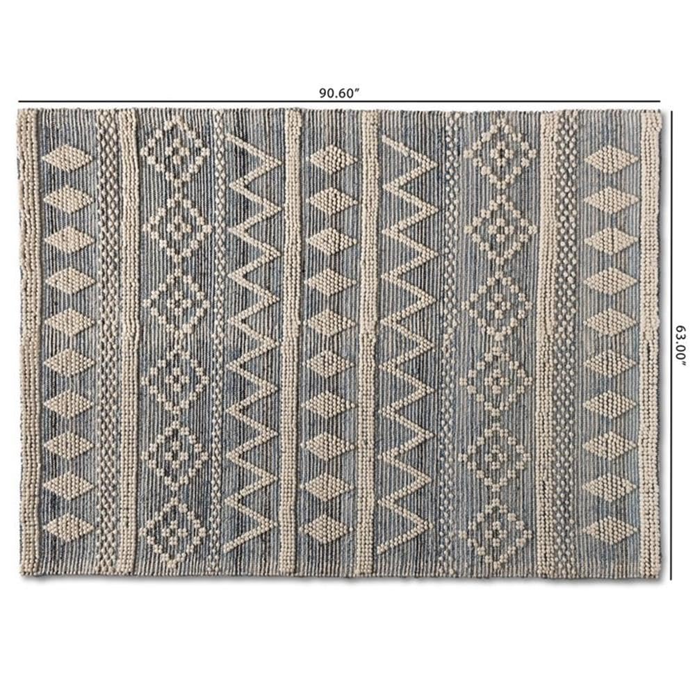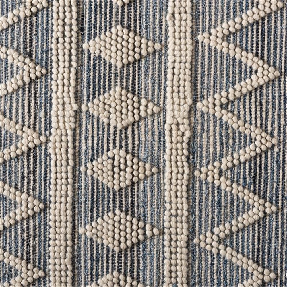 Leave an impression on your guests with the contemporary design of the Callum rug. Handwoven in India, this rug is comprised of wool and denim. Lively shades of ivory and blue come together to form a tranquil, soothing color palette that complements any home. A geometric pattern featuring diamonds and crisp angles adds texture and depth for an eye-catching accent of modern design. A calming yet visually striking addition, the Callum rug enhances the feel of any space.Features:Handwoven50% wool and 50% denimPile Height: 0.50 inchesLatex freeIndoor use onlyVacuum clean or spot clean with a dry, un-dyed clothMade in IndiaSpecifications:Product Dimensions: Dimensions: 0.5" High x 63" Wide x 90.6" Deep;