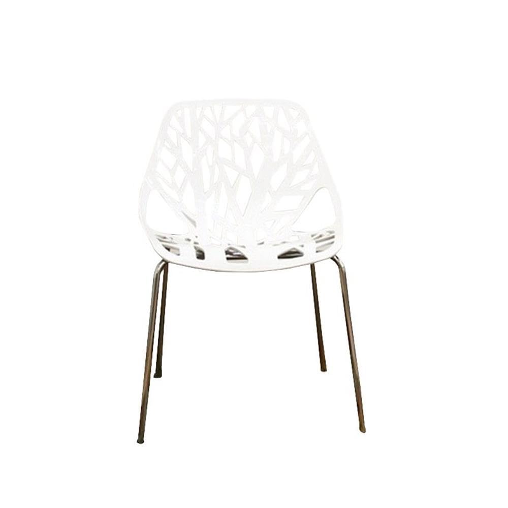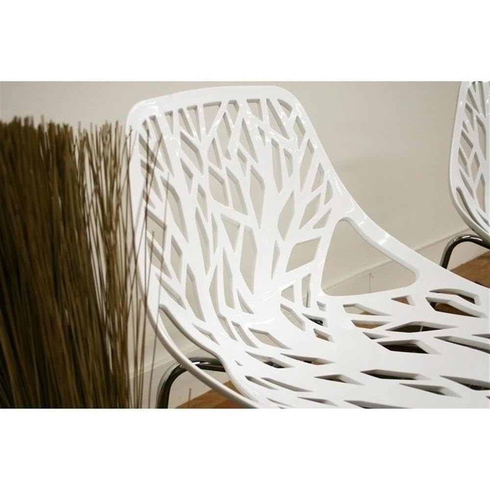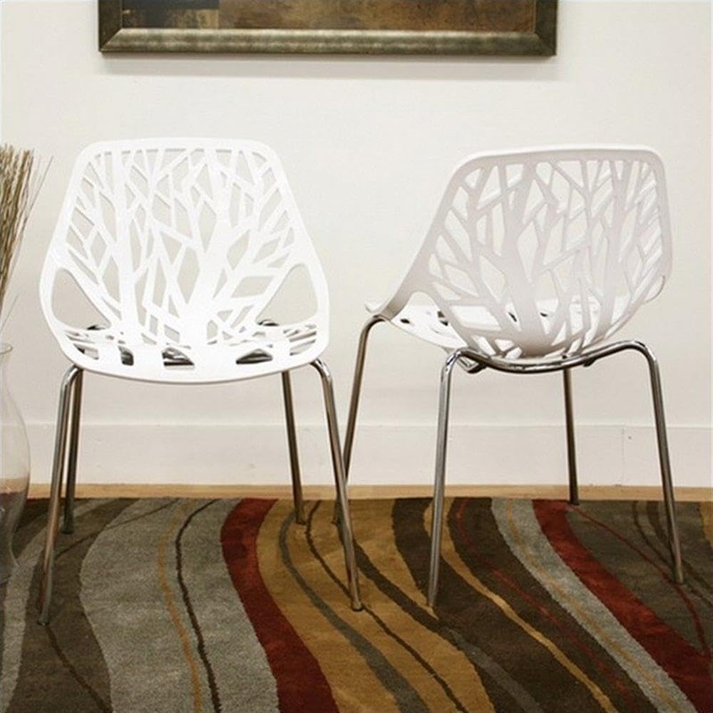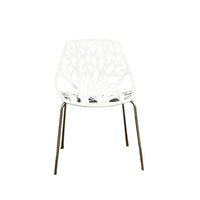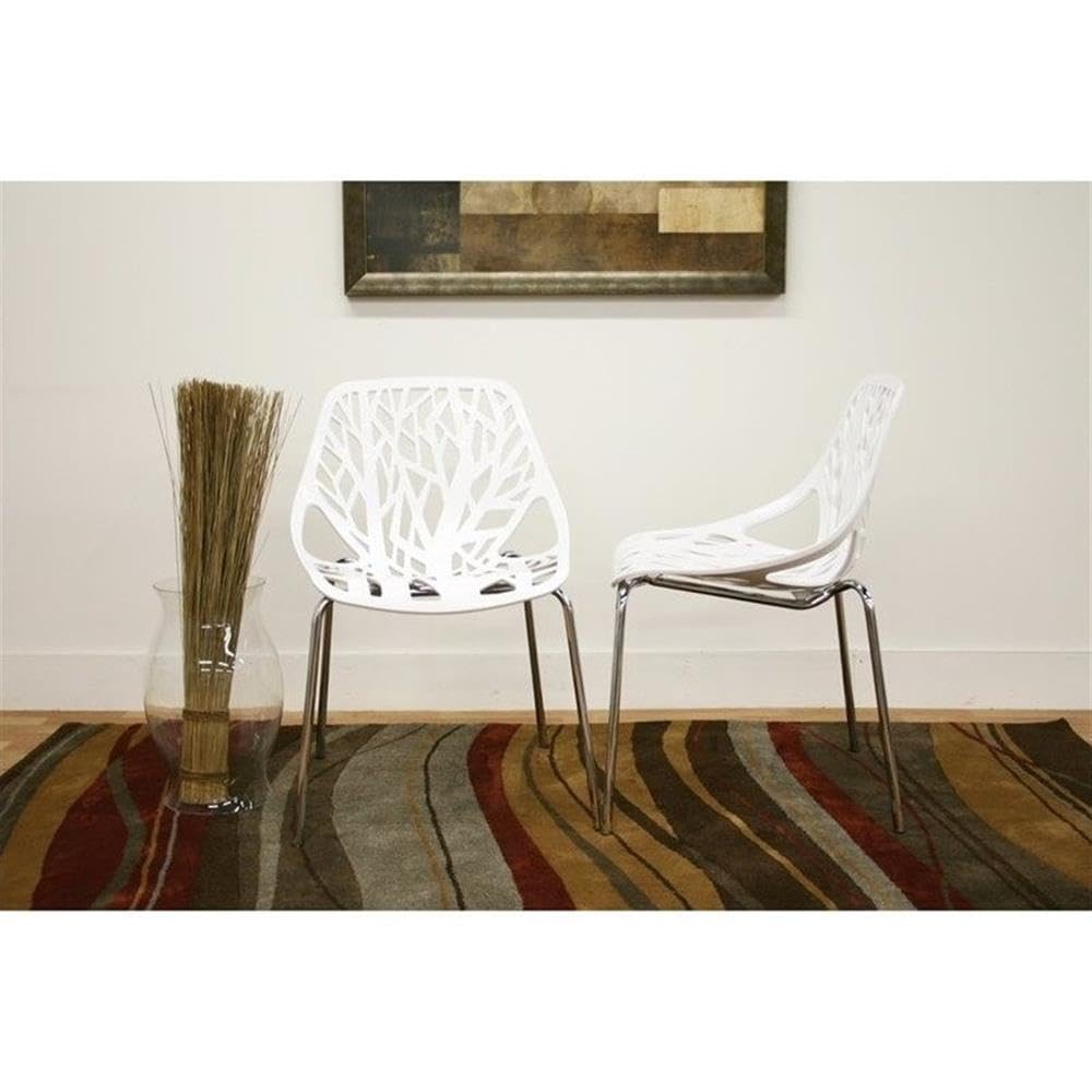 This chair lends a modern touch of the beauty of a white birch tree to your home. The intricate cut-out design is ideal around a minimalistic dining table or simply as a standalone chair in an entryway or extra room. It is constructed with a sturdy molded plastic seat atop a steel frame with a shiny silver chrome finish. Black non-marking feet finish off the chair. This chair is sold as a set of two, is stackable, and assembly is required.