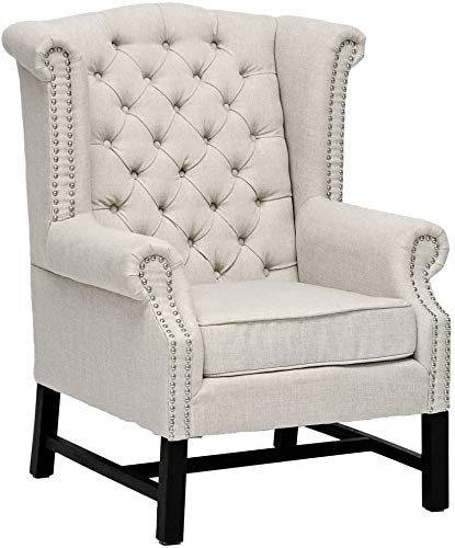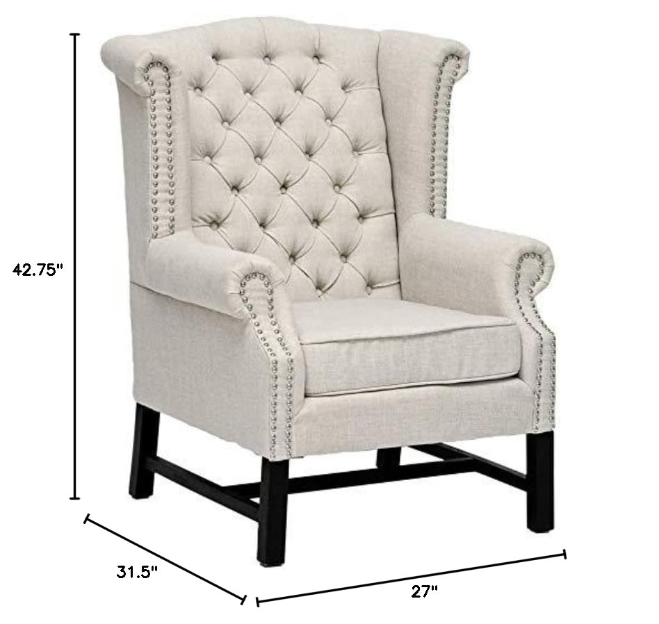 A refined elegance with a hint of regal inspiration sets the Sussex Club Chair in a class of its own. Taking basic light beige linen rather than a rich, brightly-colored brocade, the chair's stately form is a juxtaposition against the fabric. Button tufting accents the back while silver nail head trim lines the scalloped armrests and backrest. The chair is built on a birch wood frame with black legs and foam cushioning. The Sussex Chair is made in China and should be spot cleaned. Fully assembled. OVerall Dimensions: 42-3/4-inch H by 31-1/2-inch L by 27-inch W.