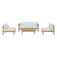 Experience relaxation and tranquility with the exquisite Bayport Teak Outdoor Collection. Embrace the gentle touch of morning breezes and bask in the warmth of sunny afternoons with this versatile series, thoughtfully designed to fit any outdoor space. Crafted from durable teak wood, renowned for its resilience against harsh weather, each piece is complemented by all-weather, machine washable white cushions. The Bayport collection boasts slanted backs and a range of leisure seating options, ensuring optimal comfort and style. Assembly is required. This set includes: One Bayport Coffee Table, One Bayport Loveseat, and Two Bayport Armless Chairs.