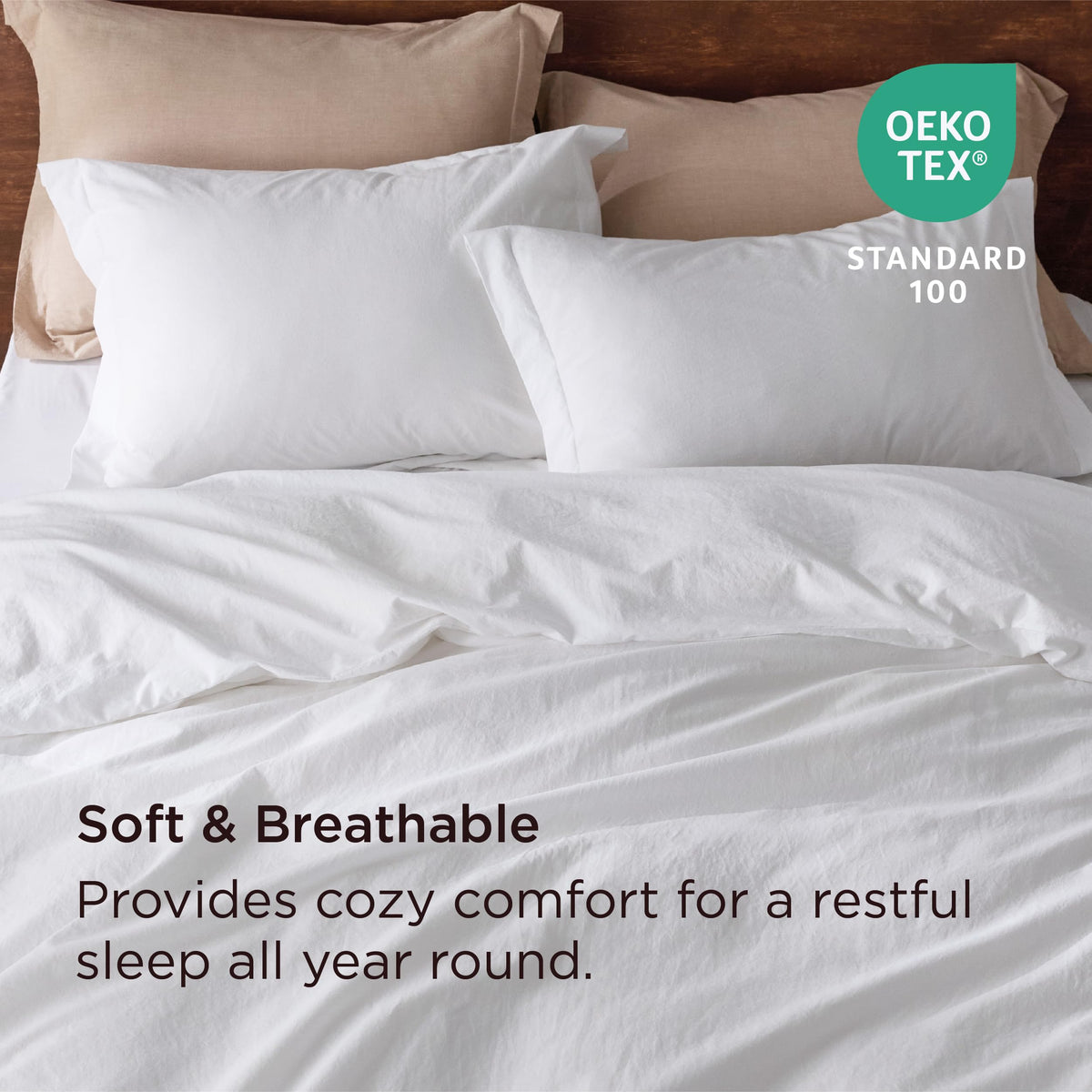 Plain and Simple: Yarn-dyed for a simple yet elegant look, this duvet cover set features a subtle dual color effect, instantly refreshing your home decor with classic style.Made with Pure Cotton: Made with 100% pure cotton, this cotton duvet cover set offers exceptional breathability with extra softness to provide the utmost coziness year round.Prewashed Texture: This washed cotton duvet cover set has been prewashed to achieve a naturally relaxed look that adds an extra layer of elegance to your bedroom decor, while also softening the bedding set for a smoother hand feel.Convenient Details: With 8 corner ties on the edges and corners, this 100% cotton duvet cover set snugly fits more than 95% comforter duvet inserts. The durable zipper closure provides easy access to swap and replace the duvet insert when needed.Easy to Maintain: This queen duvet cover is easy to maintain. Simply machine washes in cold water on a gentle cycle, and tumble dry low for a like-new restoration.What You Get: This duvet cover set includes a queen size duvet cover (90'x90') and two pillow shams (20'x26' with a 2 inch flanged edge)