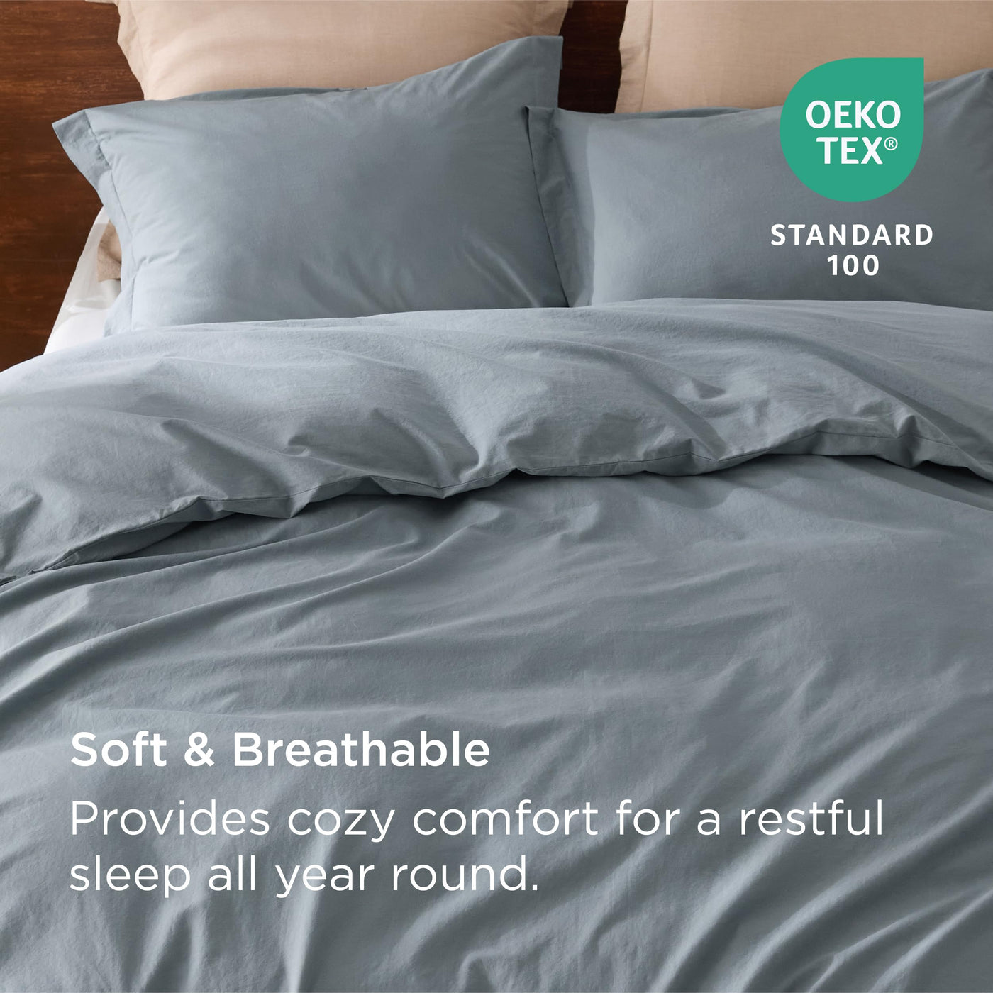 Plain and Simple: Yarn-dyed for a simple yet elegant look, this duvet cover set features a subtle dual color effect, instantly refreshing your home decor with classic style.Made with Pure Cotton: Made with 100% pure cotton, this cotton duvet cover set offers exceptional breathability with extra softness to provide the utmost coziness year round.Prewashed Texture: This washed cotton duvet cover set has been prewashed to achieve a naturally relaxed look that adds an extra layer of elegance to your bedroom decor, while also softening the bedding set for a smoother hand feel.Convenient Details: With 8 corner ties on the edges and corners, this 100% cotton duvet cover set snugly fits more than 95% comforter duvet inserts. The durable zipper closure provides easy access to swap and replace the duvet insert when needed.Easy to Maintain: This queen duvet cover is easy to maintain. Simply machine washes in cold water on a gentle cycle, and tumble dry low for a like-new restoration.What You Get: This duvet cover set includes a queen size duvet cover (90'x90') and two pillow shams (20'x26' with a 2 inch flanged edge)