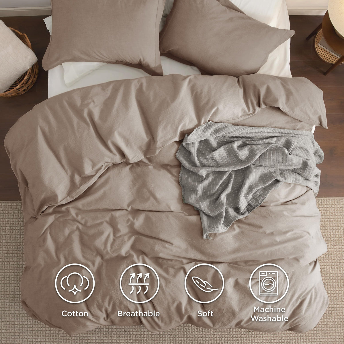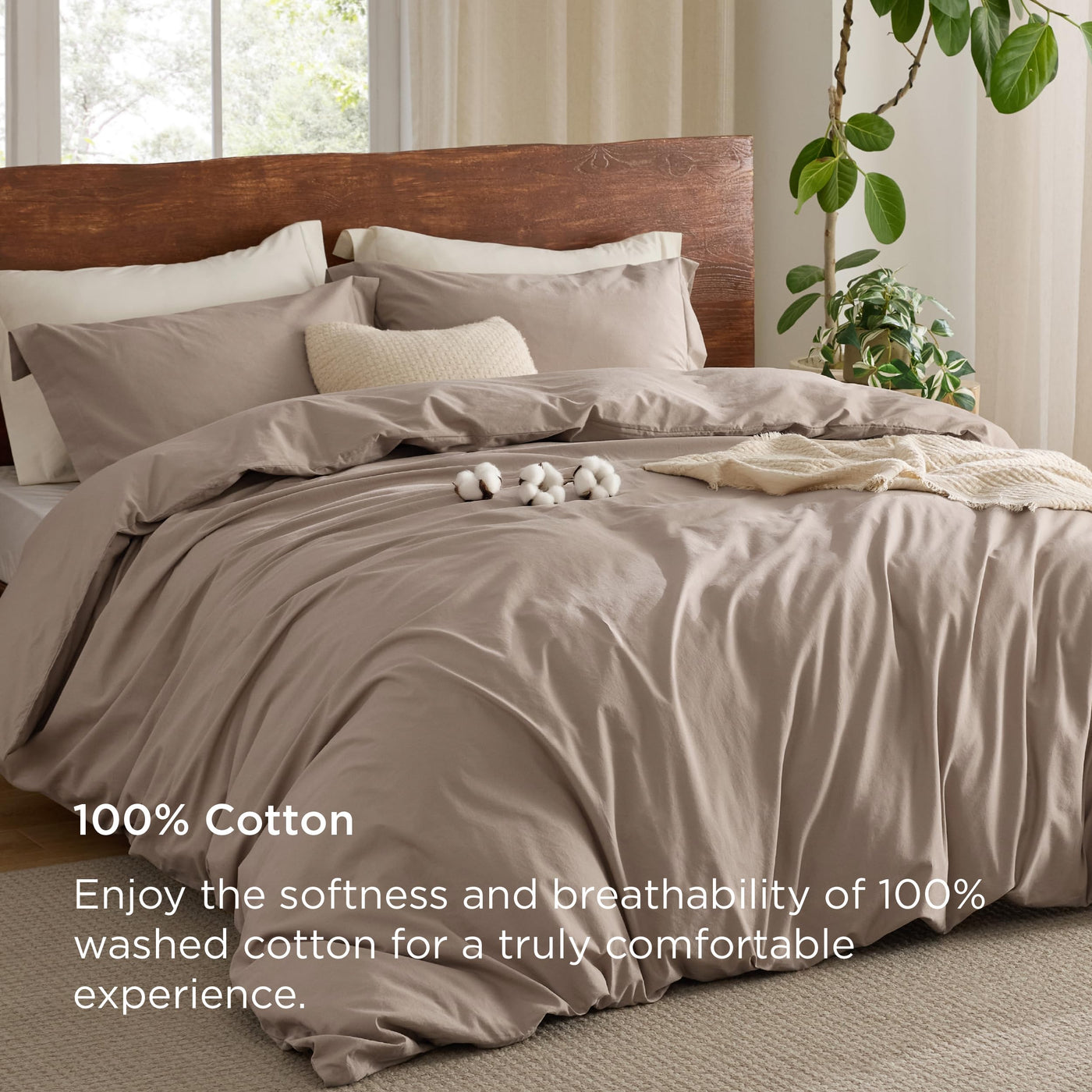 Bedsure 100% Washed Cotton Duvet Cover Queen - Taupe Minimalist Cotton Duvet Cover Set Linen Like - 3 Pieces Gentlesoft™ Plain Simple Bedding Set With 2 Pillow Shams (Taupe, Queen, 90'X90')