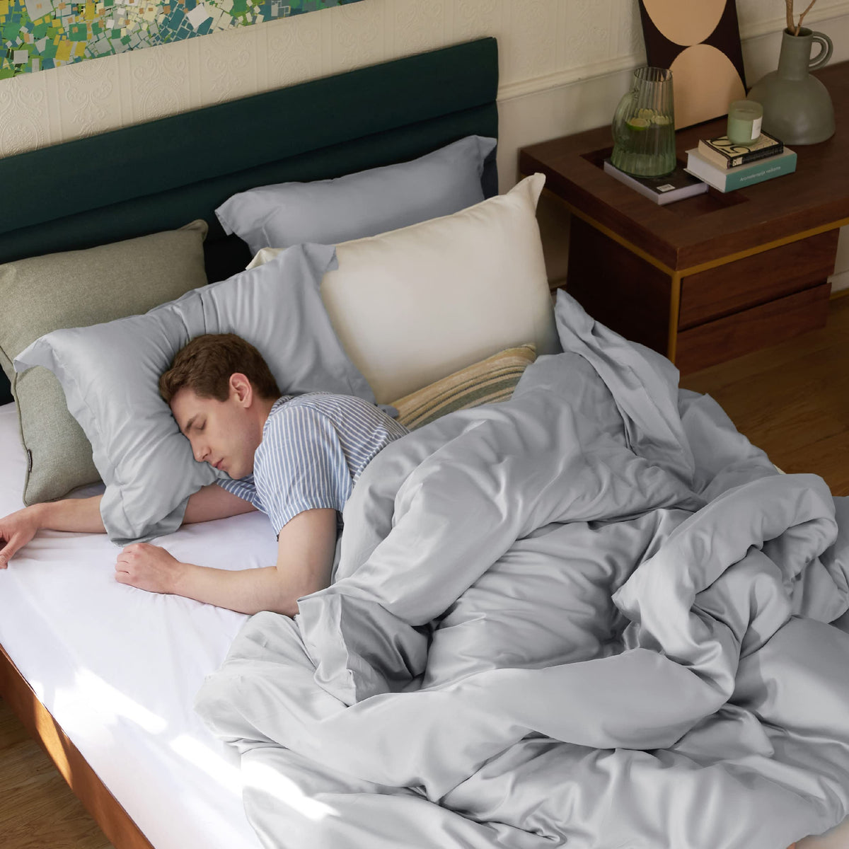 Thermoregulating: Made with a blend of cotton and lyocell, this lyocell duvet cover set is highly breathable, thermoregulating, and moisture-wicking, making this a great cooling duvet cover for hot sleepers. Silky Texture: The lyocell fibers in this cooling duvet cover provide a luxurious silky softness. The cotton blend also ensures that the duvet cover is durable and can withstand regular use and washing. Natural Material: Both cotton and lyocell are natural fibers, making this lyocell and cotton duvet cover set a great choice for those who prefer eco-friendly bedding. These materials are also hypoallergenic and gentle on sensitive skin. Premium Quality: The 8 corner ties keep your comforter/duvet insert in place without shifting or bunching, while the fabric can withstand washes without hardening, pilling, or wrinkling, providing the utmost coziness year-round. Easy to Care: The Bedsure Cotton Lyocell Hybrid Duvet Cover Set is easy to maintain. Simply machine-wash at low temperatures and on a gentle cycle for a like-new restoration without fading, shrinking, or pilling. What You Can Get: This queen size duvet cover set includes a duvet cover (90' x 90') and two pillow shams (20' x 26').