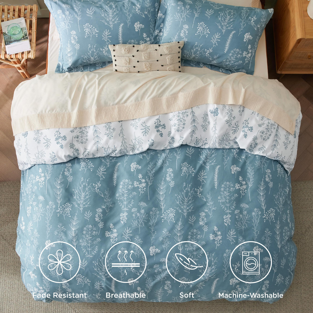 Fashionable Design: Featuring various design patterns in assorted shades of color tones to convey a cute vibe, this bedding set makes the perfect gift option for different occasions, and can be easily coordinated with most home styles.Premium Quality: This durable and breathable Bedsure duvet cover is Standard 100 by OEKO-TEX certified for safety, and can withstand washes after washes without color fades and seam slippage.Extra Comfortable: Brushed over 12 times in the manufacturing process, this vintage comforter cover set is extra delicate, soft on the skin, and free of creaky sounds.Thoughtful Details: This quilt cover comes with eight ties at each of the edges and corners to help prevent your duvet insert from bunching up inside or shifting, giving you peace of mind in bed.Easy to Care: This duvet cover set is easy to clean. Simply machine wash cold, and tumble dry low, do not bleach.What's Inside: This duvet cover set includes a Queen duvet cover (90' x 90') and two pillow shams (20' x 26'). Comforter/duvet insert sold separately.