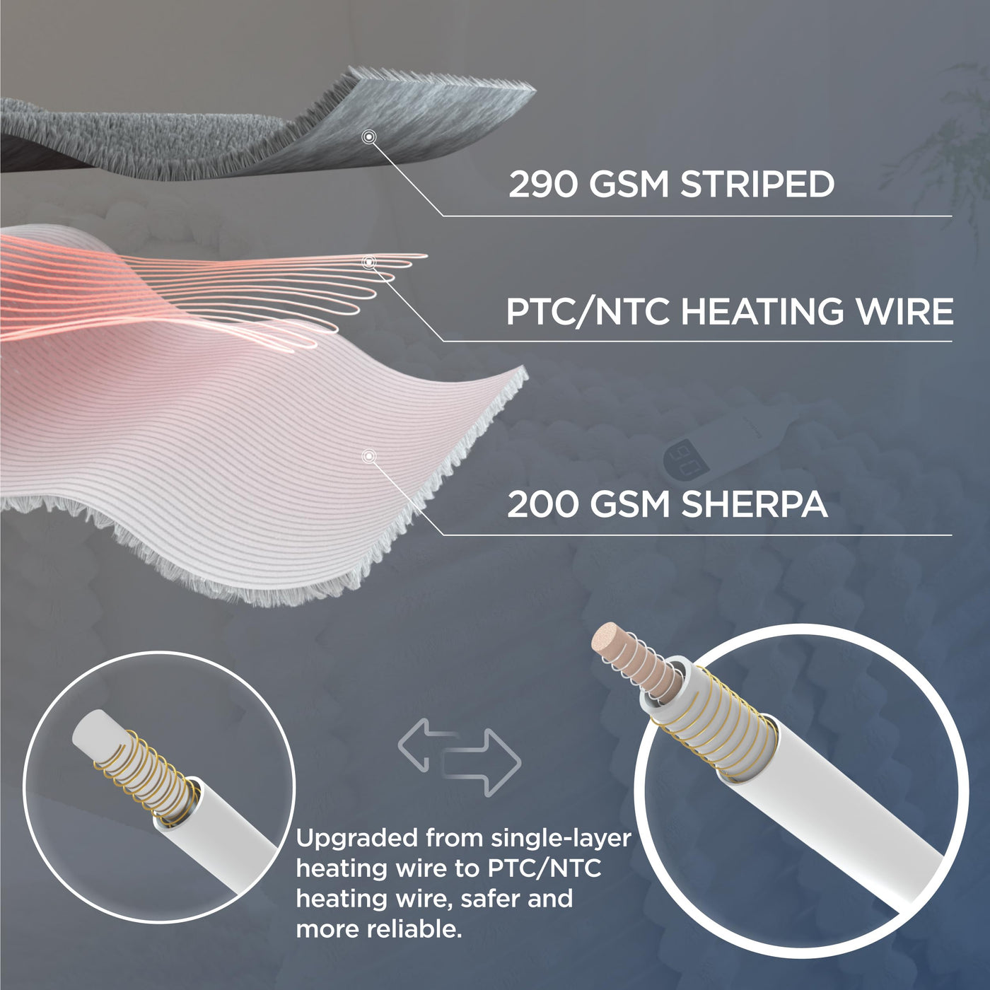 Stylish Gift: The elegantly designed 325 GSM striped flannel top and the 200 GSM premium sherpa provide a soft and warm experience, making the blanket the perfect gift option for special occasions. Comfortable Warmth: Experience quick, consistent, safe warmth powered by PTC/NTC heating wire technology. This heated blanket comes with 6 heating levels and 10 time-settings for personalized coziness. Safe: The blanket is ETL certified, and its default 8-hour auto shut-off prevents the blanket from overheating and potential risks, so you can relax and enjoy its warmth with complete peace of mind. Convenient: The included controller allows you to customize the duration and temperature to your preference, making the blanket truly personalized for your comfort. Versatile: Get the much-needed supplementary warmth with this Bedsure heated blanket at home, office, in cubicles, or just use it as a regular blanket.