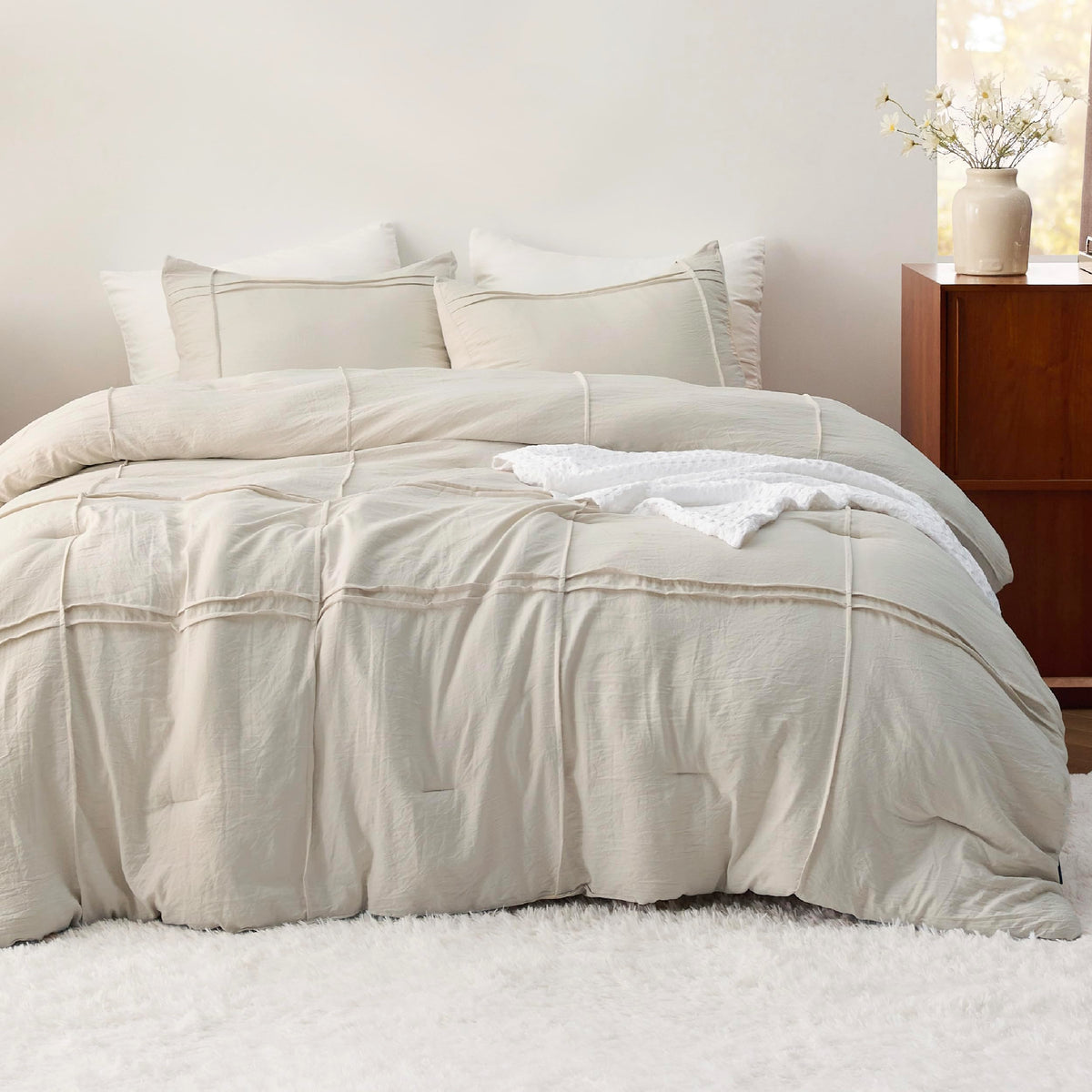 Bedsure Full Comforter Set With Sheet - 4 Pieces Soft Beige Bedding Sets, Grid Pinch Pleat, All Season Lightweight Fluffy Bed Set With Solid Boho Comforter, Pillowcases & Sheet