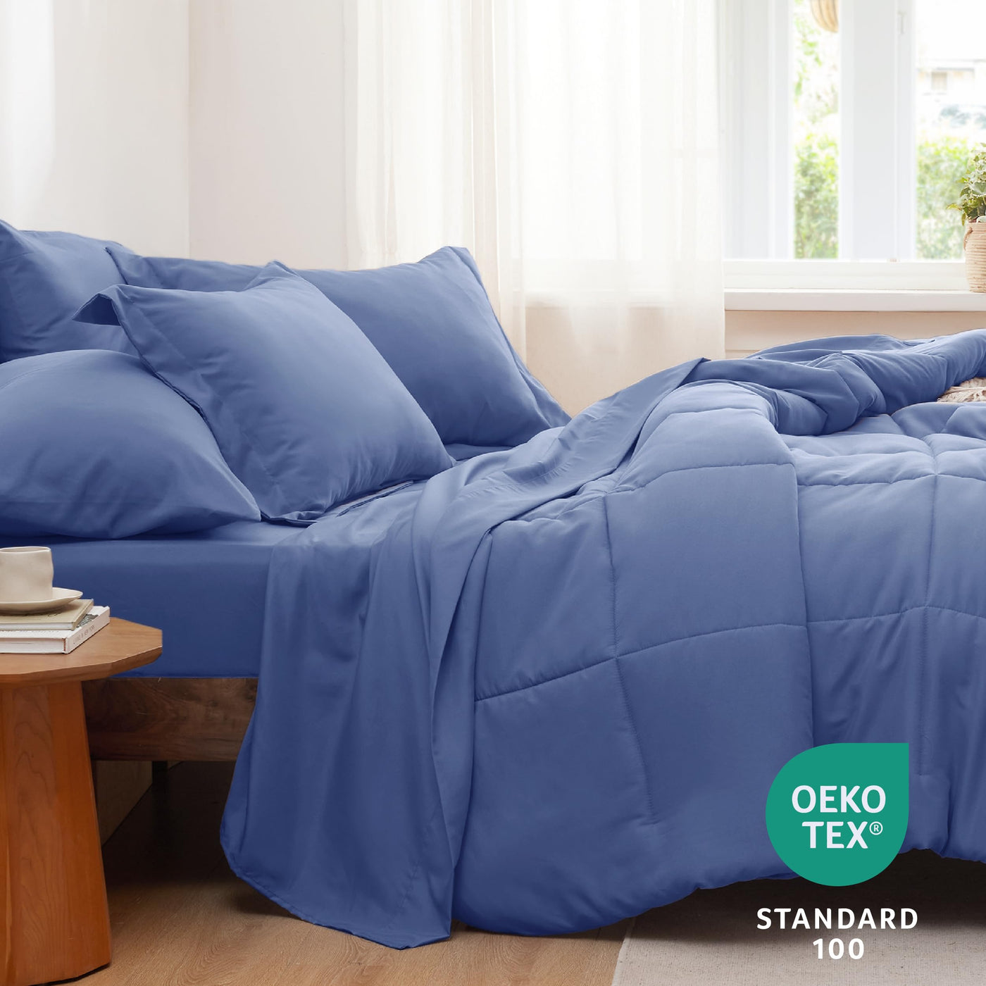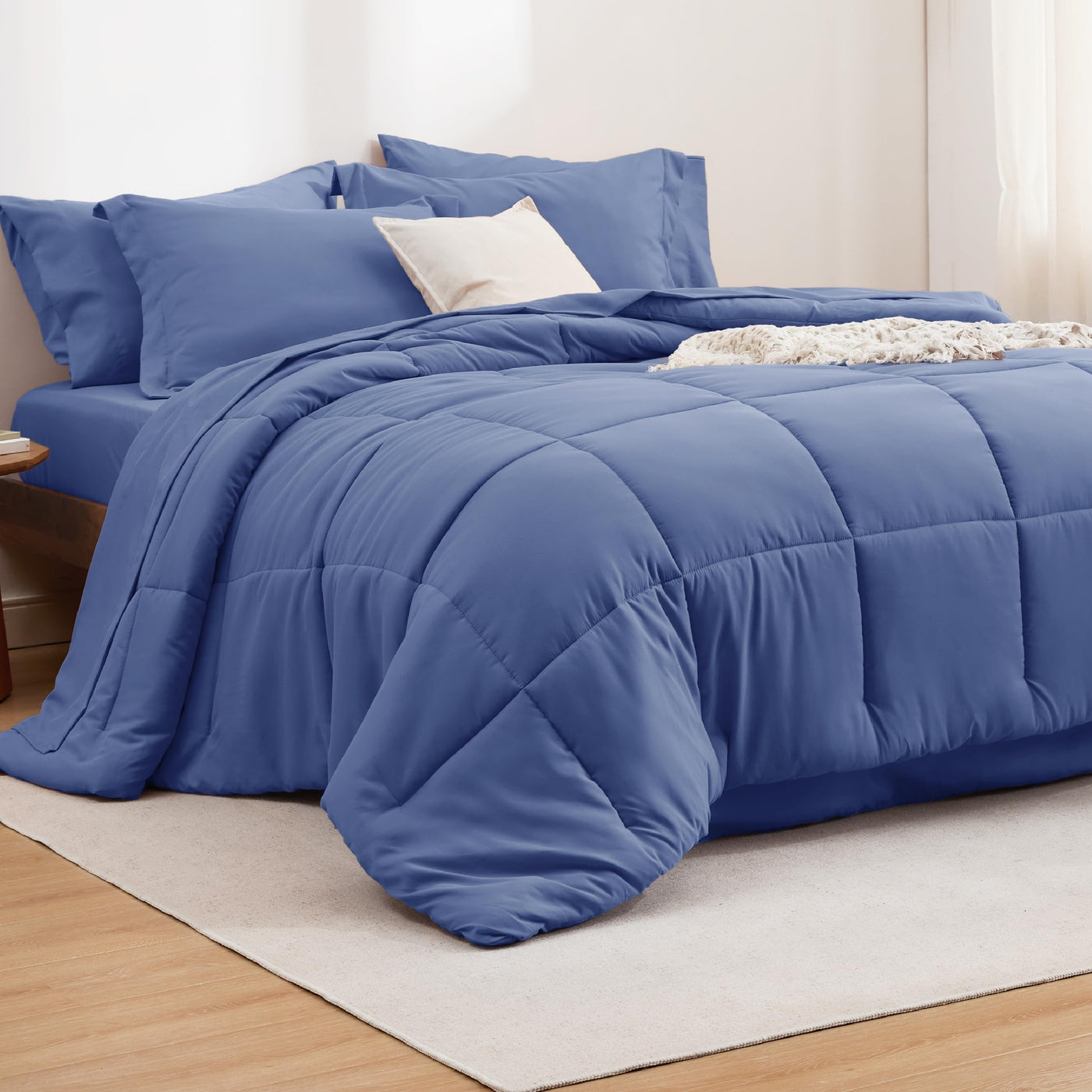 Fluffy and Comfortable: This king size comforter set is crafted from ultra-fine microfiber and filled with cloud-like fibers, providing an ideal blend of weight, softness, and warmth for year-round comfort. | Simple Elegance: Available in a range of understated yet elegant hues, this bed-in-a-bag seamlessly complements your home decor, and makes the perfect gift option for various occasions or holidays. | Certified for Safety: This bedding set is Standard 100 by OEKO-TEX certified for meeting the highest testing criteria for harmful chemicals and has been found harmless for humans. | Durability: Crafted from extra-durable polyester microfiber, this bedding set can withstand repeated washing without tearing or fading. The included comforter has a quilted design that stops the filling from moving, ensuring it stays in good shape for years. | Convenient: This inclusive king bedding set comes with a comforter (104' x 90'), two pillowcases (20' x 40'), two pillow shams (20' x 36' + 2'), a flat sheet (108' x 102') and a fitted sheet (78' x 80' + 14'). Machine wash it in cold water on a gentle cycle, and tumble dry low for a like-new restoration.