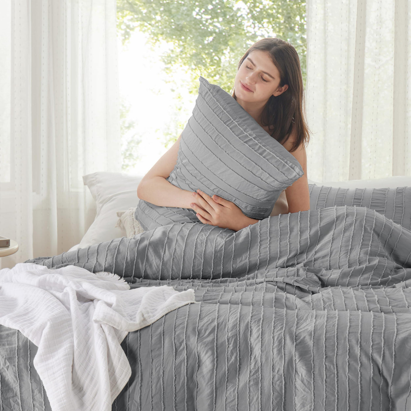 Bedsure Striped Boho Duvet Cover Queen Size - Shabby Chic Tufted Boho Bedding Set, 3 Pieces Shabby Chic Home Bedding For All Seasons, Includes 1 Queen Duvet Cover & 2 Pillowcases (Grey, 90' X 90')