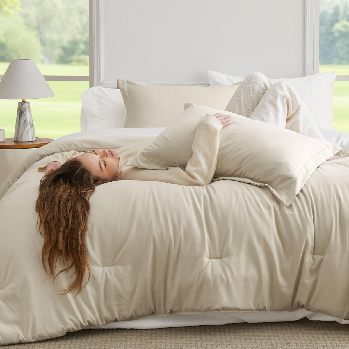 Bedsure Twin Comforter Set - 5 Pieces Beige Twin Bedding Set For All Seasons, Boho Contrasting Design Bed In A Bag With Comforter, Sheets, Pillowcase & Sham