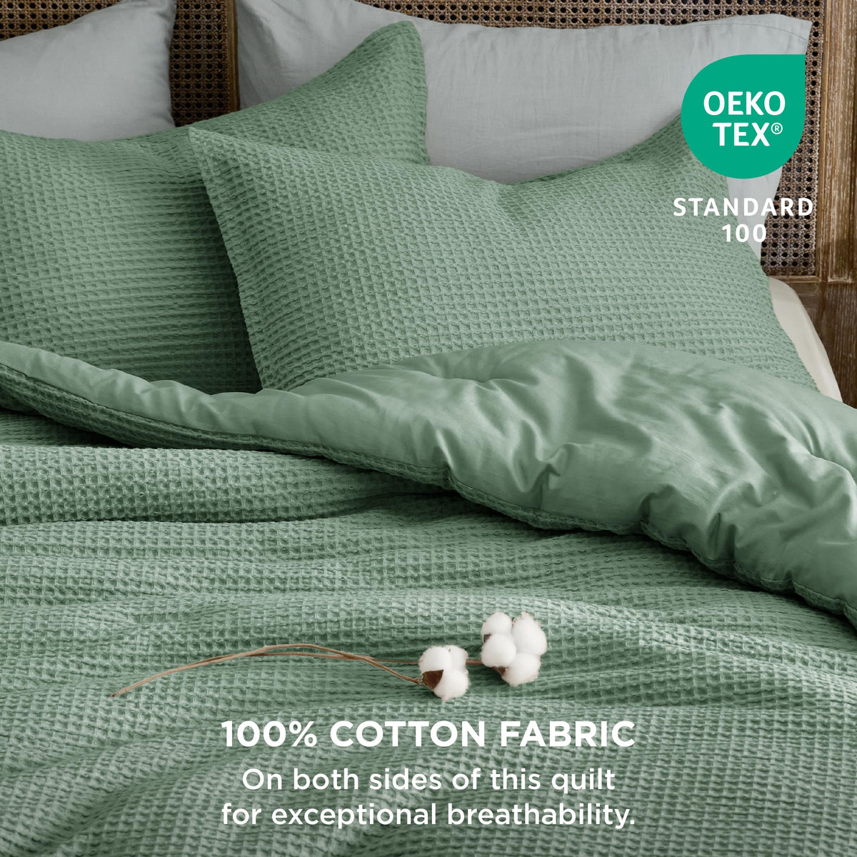 Timeless Texture: The timeless waffle weave pattern on this comforter adds an additional dimension to your space, infusing both elegance and texture for a sophisticated ambiance. Extra Cozy: The 100% cotton outer cover provides exceptional breathability and moisture-wicking properties, while the extra-fine polyester microfiber fill ensures exquisite softness and skin-friendly comfort for maximum coziness night after night. Extra Soft: This comforter set is prewashed for an unparalleled hand feel and exceptional soft touch for your comfort. Safe Material: This fluffy comforter is Standard 100 by OEKO-TEX certified for meeting the highest testing criteria for harmful chemicals and has been found harmless for humans. Easy to Maintain: This comforter is easy to maintain. Simply machine wash in cold water on a gentle cycle and tumble dry low for a like-new restoration.