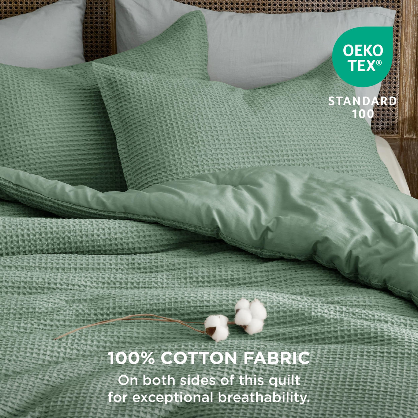 Bedsure Waffle Comforter Set King, Green Soft Cotton Bedding Set For All Seasons, Waffle Weave Bed Set, 3 Pieces, 1 Comforter (104'X90') And 2 Pillow Shams, Premium Cotton Cover With Polyester Fill