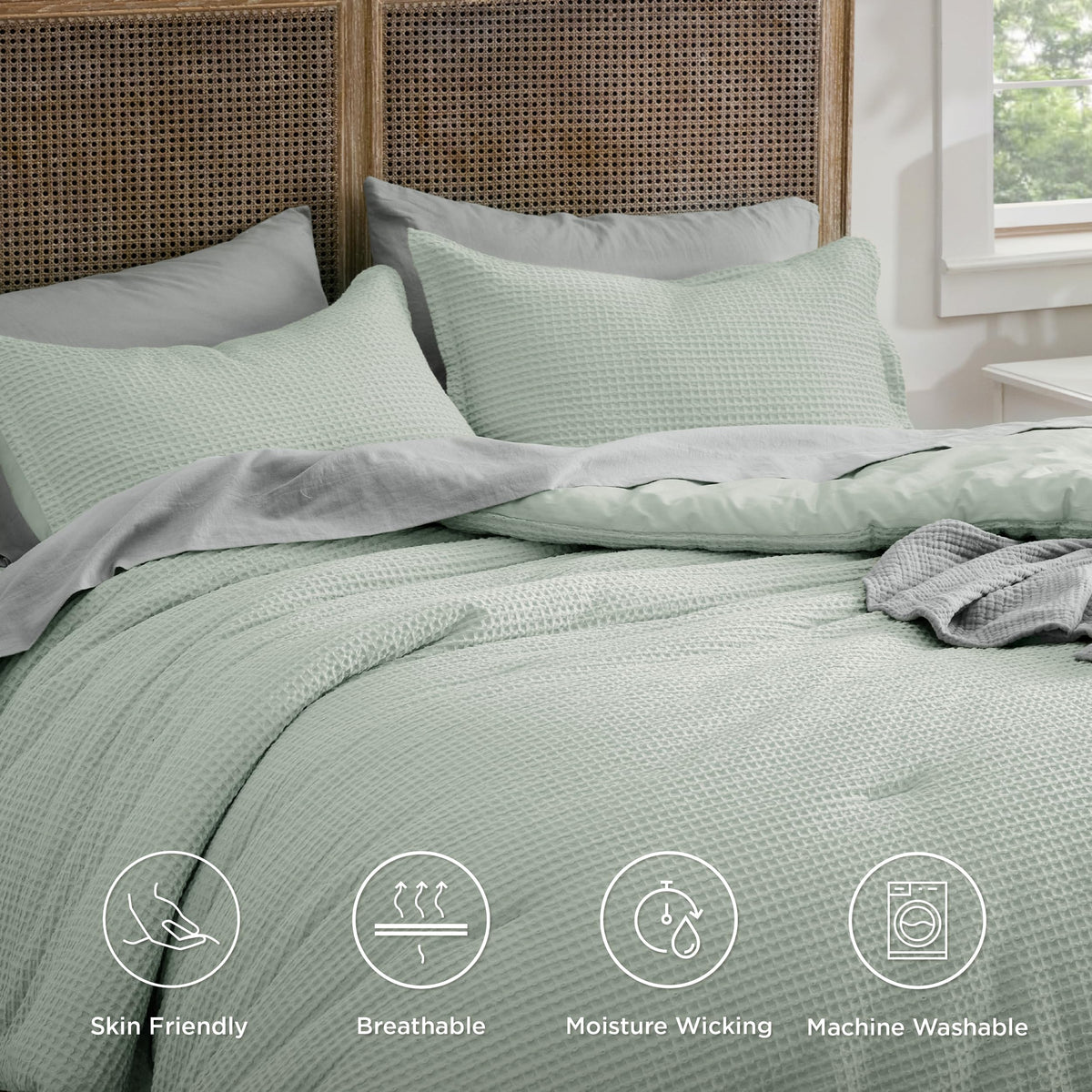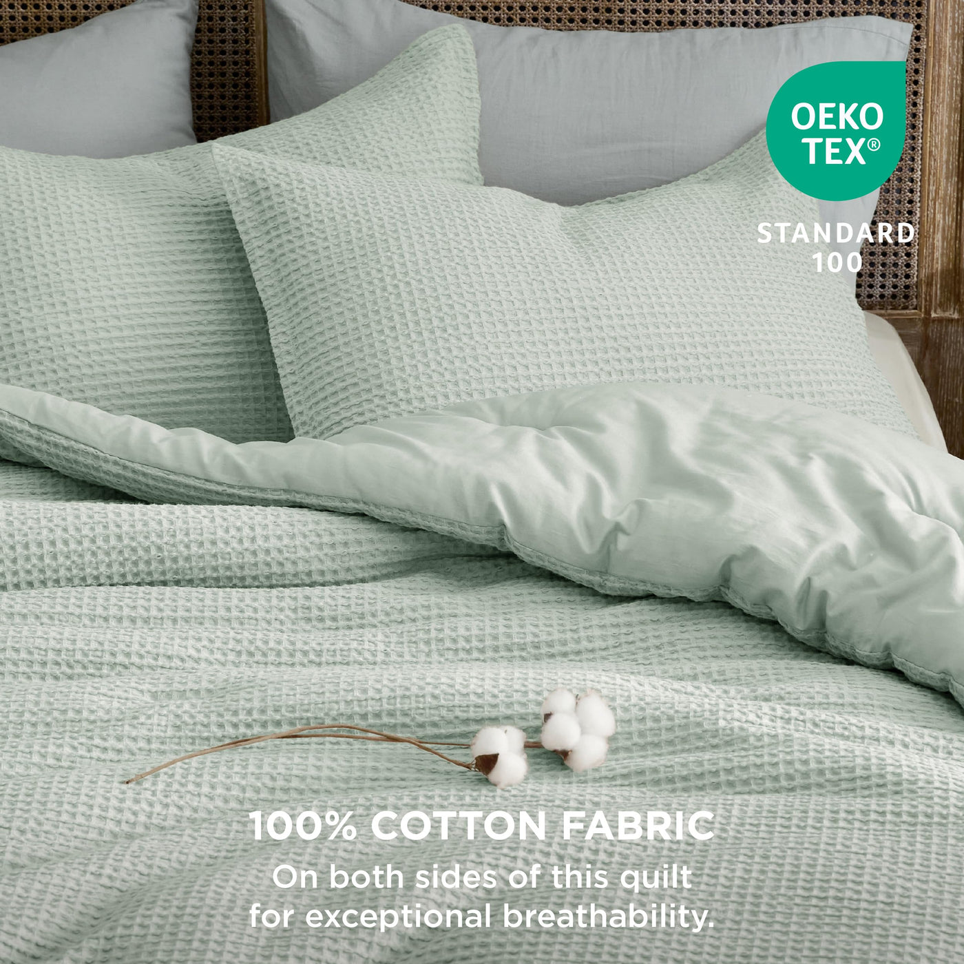 Timeless Texture: The timeless waffle weave pattern on this comforter adds an additional dimension to your space, infusing both elegance and texture for a sophisticated ambiance. Extra Cozy: The 100% cotton outer cover provides exceptional breathability and moisture-wicking properties, while the extra-fine polyester microfiber fill ensures exquisite softness and skin-friendly comfort for maximum coziness night after night. Extra Soft: This comforter set is prewashed for an unparalleled hand feel and exceptional soft touch for your comfort. Safe Material: This fluffy comforter is Standard 100 by OEKO-TEX certified for meeting the highest testing criteria for harmful chemicals and has been found harmless for humans. Easy to Maintain: This comforter is easy to maintain. Simply machine wash in cold water on a gentle cycle and tumble dry low for a like-new restoration.