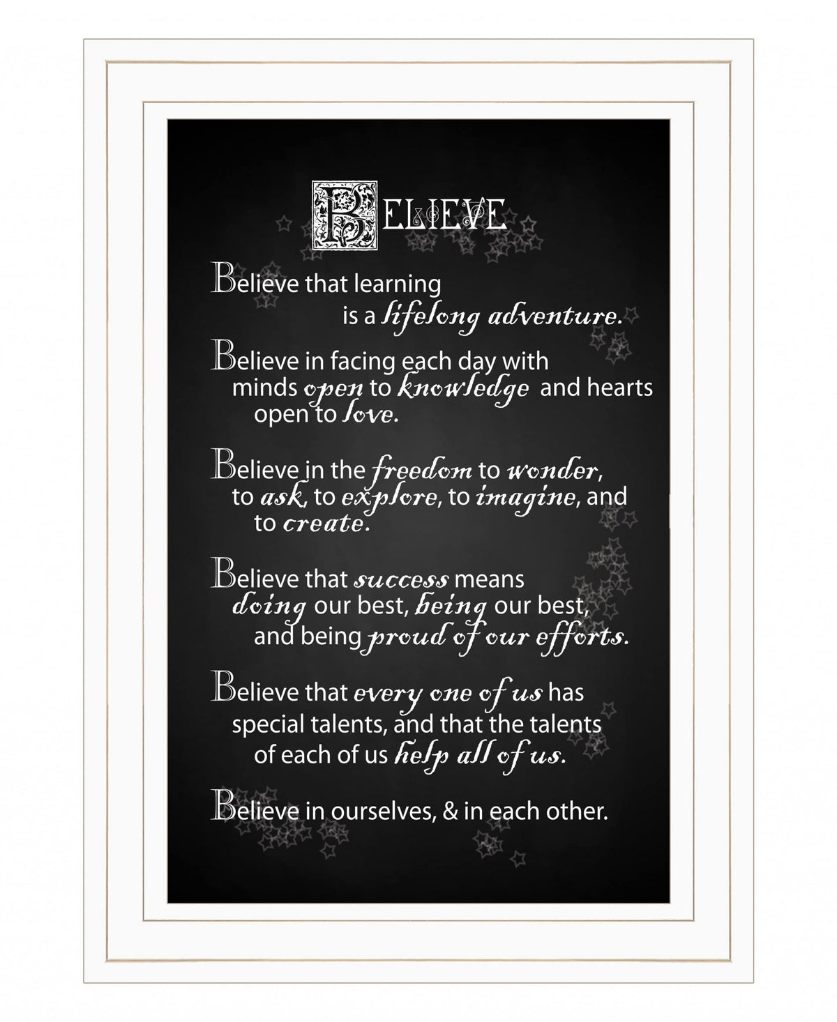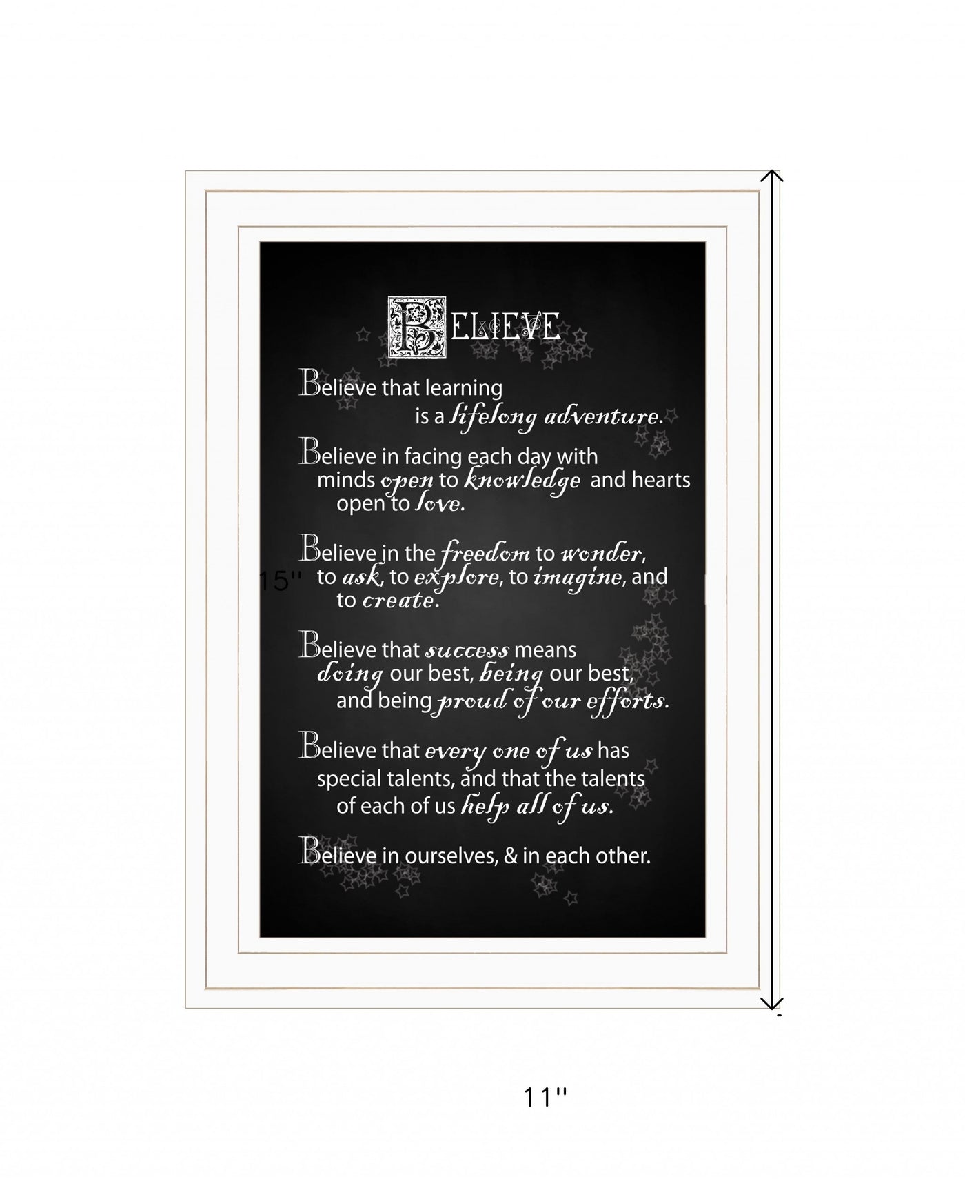 Bring some sizzle to your space with this eye-catching believe 1 white framed print wall art. This print is a visual artistic expression that allows you to decorate your space in Reproduced for you on wood, this hanging decorative accent will be a trendy and fashionable way to dress your walls in a rustic and modern farmhouse vibe. Adding this hanging wall art to your space to make your room feel more and attractive. Utilize this opportunity to create a focal point in the room with This fabulous wall decor option. 15' H x 11' W x 1' D