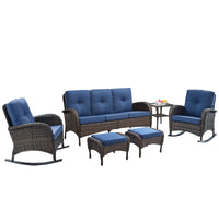 Belord Patio Rocking Chairs Furniture Set Of 6, Outdoor Wicker Furniture Sets With Wicker Rocker, Small Patio Conversation Sets With Outdoor Couch Ottomans Brown/Blue