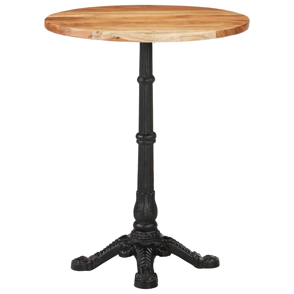 Add a touch of romantic atmosphere to your home with this wooden bistro table! The tabletop of this bistro table is made of solid acacia wood, making it sturdy and stable. The cast iron frame provides stability and robustness. This dining table even serves as a storage table for your drinks or other important items that you want to keep within reach. Important note: Colors and grain vary from piece to piece, making each sideboard unique. Delivery is random.Material: Solid acacia wood with a natural finish, cast ironOverall dimensions: 60 x 76 cm (diameter x H)Tabletop thickness: 3 cmAssembly required: Yes