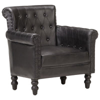 Create a slightly vintage and warm atmosphere in your interior with this stunning armchair. This chair is upholstered in durable genuine goat leather, which provides an excellent seating experience. The armchair is supported by solid mango wood legs, which make it stable and sturdy.Color: BlackMaterial: Genuine goat leather, solid mango wood Filling material: foamDimensions: 77 x 63 x 76 cm (W x D x H)Seat width: 55 cmSeat depth: 49 cmSeat height from the ground: 38 cmArmrest height from seat: 76 cmBack height from seat: 41 cmAssembly required: Yes