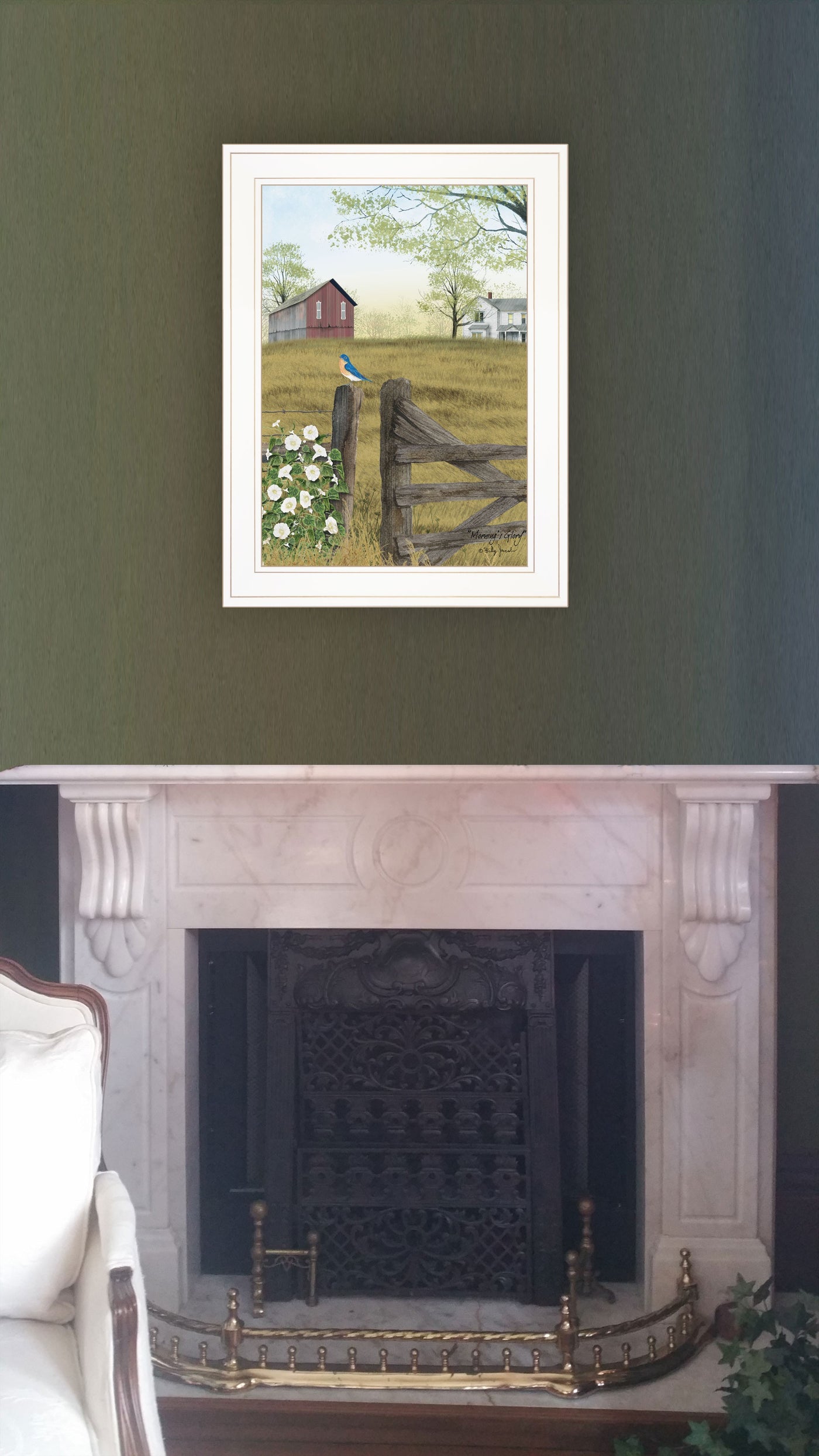 Blue Bird and Mornings Glory on the Farm White Framed Print Wall Art