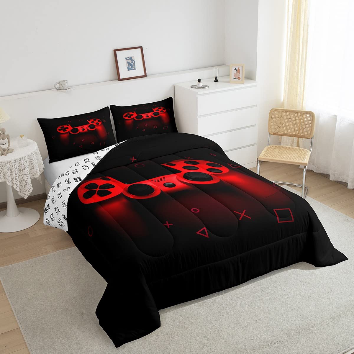 Q: Can this comforter set be used in a kids' room?A: Absolutely! The Boys Gamer Comforter Set features a unique video game design that is perfect for kids' rooms, making it an ideal choice for young gamers.