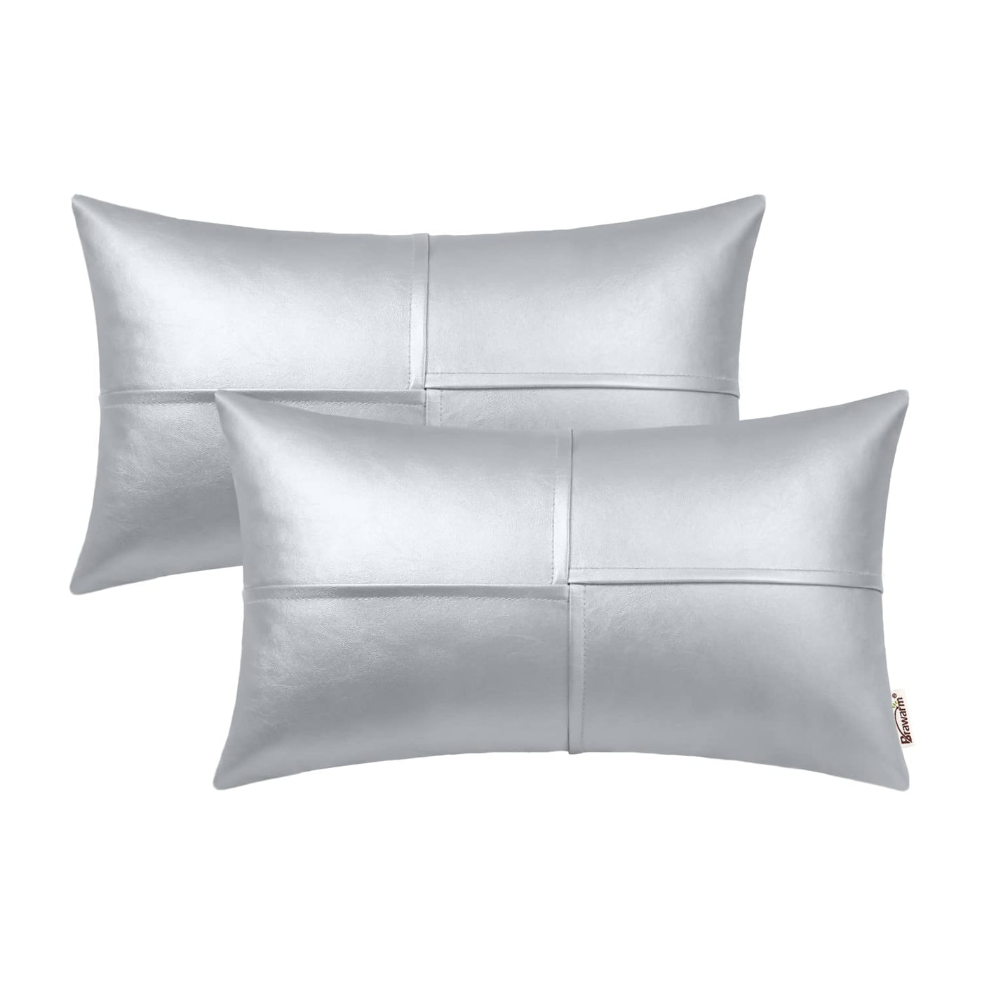 Brawarm Faux Leather Throw Pillow Covers 12 X 20 Inches, Silver Leather Lumbar Pillow Covers Pack Of 2, Hand Stitched Leather De