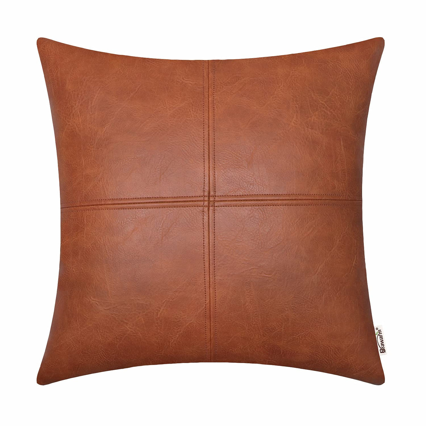 Brawarm Faux Leather Throw Pillow Covers 18 X 18 Inches, Cognac Leather Pillow Cover, Hand Stitched Leather Decorative Pillow Co